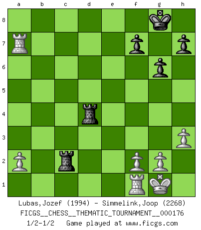 Last move : 1/2-1/2 2014 February 16 18:16:15 [Event "FICGS__CHESS__THEMATIC_TOURNAMENT__000176"] [Site "FICGS"] [Date "2014.02.09"] [Round "1"] [White "Lubas,Jozef"] [Black "Simmelink,Joop"] [Result "1/2-1/2"] [WhiteElo "1994"] [BlackElo "2268"] 1.e4 e5 2.Nf3 Nf6 3.d4 Nxe4 4.Bd3 d5 5.Nxe5 Nd7 6.Nxd7 Bxd7 7.O-O Bd6 8.c4 c6 9.Nc3 O-O 10.cxd5 Nxc3 11.bxc3 cxd5 12.Qh5 g6 13.Qxd5 Qc7 14.Bh6 Rfd8 15.Qf3 Qxc3 16.Qf6 Bf8 17.Bxf8 Rxf8 18.Be4 Bc6 19.Rac1 Qb4 20.Bxc6 bxc6 21.Rxc6 Rad8 22.Ra6 Qxd4 23.Qxd4 Rxd4 24.Rxa7 Rc8 25.h3 Rc2 1/2-1/2 Petrov : Modern attack, Symmetrical variation Kingside Castling by player White (move 7) Kingside Castling by player Black (move 9) This chess game ended in a draw. Follow this game move after move (download)A man without frontiers. He didn't divide the East and the West, he brought them together in their admiration for him. (Ljubomir Ljubojevic, about Bobby Fischer's death) Privat ist Kortschnoi kein schlechter Mensch, sehr sympathisch. Aber während des Spiels ist er grausam. Er will dich töten. (Miguel Najdorf) Una victoria por una combinación errónea, aunque sea espectacular, me llena de horror artístico. (Wilhelm Steinitz) Toutes les manuvres exécutées sur une colonne ouverte ont pour but ultime l'intrusion définitive sur la septième ou la huitième rangée, en plein cur de la position ennemie. (Aaron Nimzovitch) Shallow men believe in luck. Strong men belive in cause and effect. (Ralph Waldo Emerson)