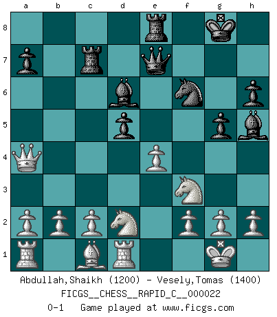 Last move : 0-1 2007 May 1 1:20:32 [Event "FICGS__CHESS__RAPID_C__000022"] [Site "FICGS"] [Date "2007.02.12"] [Round "1"] [White "Abdullah,Shaikh"] [Black "Vesely,Tomas"] [Result "0-1"] [WhiteElo "1200"] [BlackElo "1400"] 1.e4 e5 2.Nf3 Nc6 3.Bc4 h6 4.d4 Nxd4 5.Bxf7+ Kxf7 6.Nxe5+ Ke6 7.Qxd4 c6 8.Ng6 Rh7 9.Qe5+ Kf7 10.Qf5+ Nf6 11.O-O d6 12.Qf3 Bg4 13.Qb3+ d5 14.Ne5+ Kg8 15.Qxb7 Bh5 16.Rd1 Bd6 17.Nf3 g5 18.Qxc6 Rc7 19.Qa4 Qe7 20.Nbd2 Re8 0-1 This chess game has been lost on time (started : 2007.02.12 23:3:27) King's pawn game Kingside Castling by player White (move 11) Player Black won this chess game. Follow this game move after move (download)Chess is really ninety nine percent calculation. (Soltis) Das typische an einem Großmeister ist, daß er eine gewonnene Position schnell und schmerzlos gewinnt. (Irving Chernev) ¿Que sería del Ajedrez sin errores graciosos?. (Kurt Richter) Vous m'avez demandé de vous exposer quel est le fondement de la prière. Je ne fais que préparer les pièces du jeu sur la table... Nous sera-t-il permis d'en adopter les règles et si nous les appliquons scrupuleusement nous ne tarderons pas à faire mat le Roi divin ! Il ne pourra échapper à nos mains. (Sainte Thérèse d'Avila, Chemin de perfection) 98% of all statistics are made up. (Author unknown)