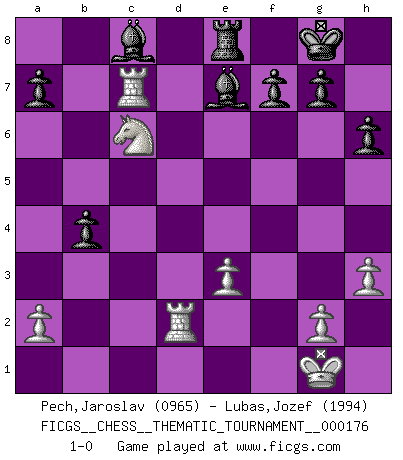 Last move : 1-0 2014 September 17 20:5:7 [Event "FICGS__CHESS__THEMATIC_TOURNAMENT__000176"] [Site "FICGS"] [Date "2014.02.09"] [Round "1"] [White "Pech,Jaroslav"] [Black "Lubas,Jozef"] [Result "1-0"] [WhiteElo "0965"] [BlackElo "1994"] 1.e4 e5 2.Nf3 Nf6 3.d4 Nxe4 4.Bd3 d5 5.dxe5 Be7 6.O-O O-O 7.c4 Nc6 8.Bc2 Nb4 9.cxd5 Nxc2 10.Qxc2 Qxd5 11.Rd1 Qc6 12.Qxc6 bxc6 13.Be3 c5 14.Nbd2 Nxd2 15.Rxd2 Rb8 16.Rc1 Rb5 17.h3 h6 18.b3 Ra5 19.b4 cxb4 20.Rxc7 Re8 21.Nd4 Rxe5 22.Nc6 Rxe3 23.fxe3 1-0 Petrov : Modern attack, Symmetrical variation Kingside Castling by player White (move 6) Kingside Castling by player Black (move 6) Player White won this chess game. Follow this game move after move (download)Suddenly it was obvious to me in my analysis I had missed what Fischer had found with the greatest of ease at the board. (Mikhail Botvinnik) Kombinieren und Schwarzhandel gehören verboten. (Savielly Grigorievitsch Tartakower) El tablero es el mundo, las piezas es el fenomeno del universo, las reglas del juego son lo que llamamos leyes de la naturaleza y el jugador del lado opuesto, se encuentra oculto a nuestra vista. (Thomas Huxley) Les pièces de l'échiquier étaient impitoyables. Elles le retenaient, elles l'absorbaient. Il y avait de l'horreur en cela, mais aussi une harmonie unique. Car, qu'y a-t-il dans le monde, à part les échecs ? (V. Nabokov) Perhaps the current trend of many chess professionals taking up the more lucrative pastime of poker is not a wholly negative one. It may not be too late for humans to relearn how to take risks in order to innovate and thereby maintain the advanced lifestyles we enjoy. And if it takes a poker-playing supercomputer to remind us that we can't enjoy the rewards without taking the risks, so be it. (The Chess Master and the Computer, by Garry Kasparov - 2010)