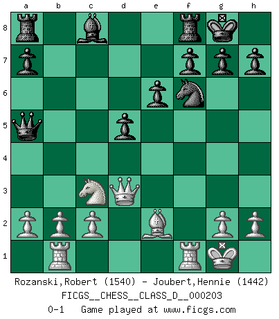 Last move : 0-1 2014 May 18 9:25:42 [Event "FICGS__CHESS__CLASS_D__000203"] [Site "FICGS"] [Date "2014.02.10"] [Round "1"] [White "Rozanski,Robert"] [Black "Joubert,Hennie"] [Result "0-1"] [WhiteElo "1540"] [BlackElo "1442"] 1.e4 c5 2.Nf3 e6 3.d4 cxd4 4.Nxd4 Nf6 5.Nc3 Qb6 6.Be2 Bc5 7.Be3 Nc6 8.Nxc6 Bxe3 9.fxe3 bxc6 10.Rb1 Qxe3 11.Qd3 Qb6 12.Na4 Qa5+ 13.Nc3 O-O 14.O-O d5 15.exd5 cxd5 0-1 This chess game has been lost on time (started : 2014.02.10 0:3:29) Sicilian : Anderssen variation Kingside Castling by player Black (move 13) Kingside Castling by player White (move 14) Player Black won this chess game. Follow this game move after move (download)Best by test: 1. e4 (Bobby Fischer) Sie führen leise Selbstgespräche, schlürfen lautstark ihre Getränke, schmatzen hörbar beim Essen, blasen ihrem Gegenüber Rauch in die Augen, niesen ihm ins Gesicht, starren ihn unverwandt an, bis er sich unter ihren Blicken windet, rutschen ständig auf ihrem Stuhl hin und her, rülpsen und bohren in der Nase. (Anonymous) Botvinnik trató de alejar el misterio referente al Ajedrez, siempre relacionandolo a situaciones de la vida diaria. Solía llamar al Ajedrez un problema inexacto típico, similar a aquellos en que la gente tiene siempre que resolver a cada día. (Garry Kasparov) Un journaliste : 'Vous préférez avoir une dame de plus sur l'échiquier ou au lit ?' Boris Spassky : 'Ca dépend de la position.' 'preceded by its own quotation yields a falsehood' preceded by its own quotation yields a falsehood. (W. V. O. Quine - Set Theory And Its Logic, 1953)