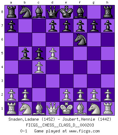 Last move : 0-1 2014 March 24 4:45:3 [Event "FICGS__CHESS__CLASS_D__000203"] [Site "FICGS"] [Date "2014.02.10"] [Round "1"] [White "Snaden,Ladane"] [Black "Joubert,Hennie"] [Result "0-1"] [WhiteElo "1452"] [BlackElo "1442"] 1.d4 Nf6 2.c4 c5 3.d5 b5 0-1 This chess game has been lost on time (started : 2014.02.10 0:3:29) Benko gambit Player Black won this chess game. Follow this game move after move (download)We cannot resist the fascination of sacrifice, since a passion for sacrifices is part of a Chessplayer's nature. (Rudolf Spielman) Wer nie einen Fehler gemacht hat, hat nie etwas Neues ausprobiert. (Albert Einstein) Aquel que ve no otra dirección en el juego que la de dar Jaque Mate a su oponente, nunca será un buen jugador de Ajedrez. (Euwe) Les échecs sont un jeu par leur forme, un art par leur essence et une science par sa difficulté d'acquisition. Ils peuvent vous procurer autant de plaisir qu'un bon livre ou une belle musique, mais vous n'aurez une réelle joie que si vous arrivez à bien jouer. (Tigran Petrosian) The only thing that matters is the evidence. (Horatio Caine, C.S.I. Miami)