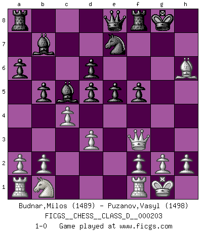 Last move : 1-0 2014 May 17 21:24:19 [Event "FICGS__CHESS__CLASS_D__000203"] [Site "FICGS"] [Date "2014.02.10"] [Round "1"] [White "Budnar,Milos"] [Black "Puzanov,Vasyl"] [Result "1-0"] [WhiteElo "1489"] [BlackElo "1498"] 1.e4 e5 2.Nf3 Nc6 3.Bb5 a6 4.Ba4 Bc5 5.O-O b5 6.Bb3 Nf6 7.Ng5 O-O 8.d3 h6 9.Nh3 d6 10.Bd5 Bb7 11.c3 Nxd5 12.exd5 Ne7 13.c4 c6 14.Qg4 f5 15.Qh5 Qe8 16.Qf3 g5 17.Nxg5 hxg5 18.Bxg5 cxd5 19.Bh6 1-0 This chess game has been lost on time (started : 2014.02.10 0:3:29) Ruy Lopez : Classical defense deferred Kingside Castling by player White (move 5) Kingside Castling by player Black (move 7) Player White won this chess game. Follow this game move after move (download)I have never in my life played the French Defence, which is the dullest of all openings. (Wilhelm Steinitz) Obwohl ich vom Stil her kaum zu den Priestern der Schachkunst gezählt werde, halte ich Schach doch für eine Kunst. (Tigran Petrosjan) No es una movida, aún la mejor movida que tu debas buscar, sino un plan comprensible. (Eugene Znosko-Borovsky) La menace est plus forte que l'exécution. (Aaron Nimzovitch) Mandala - that's it! 16x16 squares as multiple of the four and the eight because of the Four Noble Truths and the Noble Eightfold Path. (Heinz-Georg Lehnhoff about Big Chess)