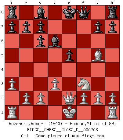 Last move : 0-1 2014 May 14 21:20:4 [Event "FICGS__CHESS__CLASS_D__000203"] [Site "FICGS"] [Date "2014.02.10"] [Round "1"] [White "Rozanski,Robert"] [Black "Budnar,Milos"] [Result "0-1"] [WhiteElo "1540"] [BlackElo "1489"] 1.e4 e5 2.Nf3 Nc6 3.Bb5 f5 4.Nc3 fxe4 5.Nxe4 Nf6 6.Nxf6+ Qxf6 7.Qe2 Nb4 8.d3 Bd6 9.a3 Nc6 10.Bg5 Qf8 11.Bxc6 dxc6 0-1 This chess game has been lost on time (started : 2014.02.10 0:3:29) Ruy Lopez : Schliemann defense, Berger variation Player Black won this chess game. Follow this game move after move (download)When your house is on fire, you can't be bothered with the neighbors. Or, as we say in Chess, if your King is under attack you don't worry about losing a Pawn on the Queen's side. (Gary Kasparov) Ich trinke, ich rauche, ich spiele, ich liebe Frauen aber Fernschach ist ein Laster, das ich nicht habe. (Mikhail Nekhemyevich Tal) Coloca el contenido del tablero de Ajedrez en un sombrero, agita las piezas vigorosamente, derrámalas en el tablero desde una altura de medio metro y así obtienes el estilo de Wilhelm Steinitz. (H. E. Bird) Il vaut mieux sacrifier les pièces de l'adversaire. (Xavier Tartacover) Coffee just isn't my cup of tea. (Unknown)