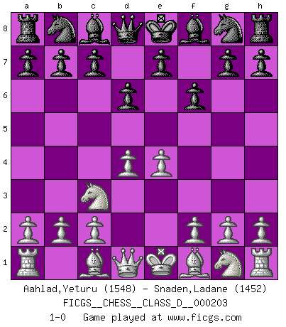 Last move : 1-0 2014 March 26 16:53:7 [Event "FICGS__CHESS__CLASS_D__000203"] [Site "FICGS"] [Date "2014.02.10"] [Round "1"] [White "Aahlad,Yeturu"] [Black "Snaden,Ladane"] [Result "1-0"] [WhiteElo "1548"] [BlackElo "1452"] 1.d4 d6 2.e4 f6 3.Nc3 1-0 This chess game has been lost on time (started : 2014.02.10 0:3:29) Queen's Pawn Player White won this chess game. Follow this game move after move (download)Of all my Russian books, the defense contains and diffuses the greatest 'warmth' which may seem odd seeing how supremely abstract Chess is supposed to be. (Vladimir Nabokov) Zum Sieg gelangt man nicht, wenn man gut, sondern nur wenn man besser spielt (Savielly Grigorievitsch Tartakower) Aquel que ve no otra dirección en el juego que la de dar Jaque Mate a su oponente, nunca será un buen jugador de Ajedrez. (Euwe) Le thème de l'attaque double intervient d'une manière ou d'une autre dans l'immense majorité des combinaisons. (Youri Averbakh) The beginning is the most important part of the work. (Plato)