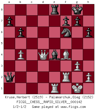 Last move : 1/2-1/2 2014 April 3 4:32:54 [Event "FICGS__CHESS__RAPID_SILVER__000142"] [Site "FICGS"] [Date "2014.02.11"] [Round "2"] [White "Kruse,Herbert"] [Black "Palamarchuk,Oleg"] [Result "1/2-1/2"] [WhiteElo "2519"] [BlackElo "2152"] 1.Nf3 Nf6 2.g3 d5 3.Bg2 c6 4.O-O Bg4 5.c4 e6 6.Qb3 b6 7.d4 Bd6 8.Nc3 Nbd7 9.cxd5 exd5 10.Ng5 h6 11.f3 Bh5 12.Nh3 O-O 13.e4 dxe4 14.Nxe4 Bc7 15.Nf4 Bxf4 16.Bxf4 Nxe4 17.fxe4 Nf6 18.Qc4 Rc8 19.Bh3 Nxe4 20.Bxc8 Qxc8 21.d5 cxd5 22.Qxd5 Bg6 23.Rac1 Qg4 24.Rc7 Qe2 25.b4 Re8 26.R7c1 Nf6 27.Qd2 Qe6 28.Rce1 Be4 29.Qd4 Qxa2 30.Rf2 1/2-1/2 Reti Opening Kingside Castling by player White (move 4) Kingside Castling by player Black (move 12) This chess game ended in a draw. Follow this game move after move (download)Many have become Chess Masters, no one has become the Master of Chess. (Siegbert Tarrasch) Pläne sind die Träume des Verständigen. (Ernst Freiherr von Feuchtersleben) En la perfecta combinación de Ajedrez como en una historia corta de primera clase, toda la trama y contra trama deberá conducir hacia un final sorprendente, el interes no es mitigado hasta el último momento. (Yates and Winter) D'abord les bases : Jouez et étudiez, puis étudiez et jouez, ensuite jouez et étudiez, puis étudiez et jouez. Deuxièmement : Donnez toujours le meilleur de vous-même ! (Ken Smith) The bottom line is always the bottom line. (Johann Piek)