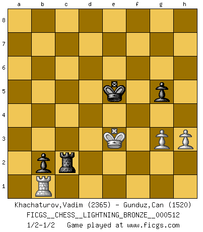 Last move : 1/2-1/2 2014 February 17 4:11:27 [Event "FICGS__CHESS__LIGHTNING_BRONZE__000512"] [Site "FICGS"] [Date "2014.02.17"] [Round "1"] [White "Khachaturov,Vadim"] [Black "Gunduz,Can"] [Result "1/2-1/2"] [WhiteElo "2365"] [BlackElo "1520"] 1.e4 e5 2.Nf3 Nc6 3.Bb5 d6 4.c3 g6 5.h3 Nge7 6.d4 exd4 7.cxd4 Bd7 8.O-O Bg7 9.Be3 O-O 10.Nc3 a6 11.Ba4 b5 12.Bb3 Na5 13.Bc2 Nc4 14.Bc1 Nc6 15.b3 Nb6 16.Bb2 b4 17.Ne2 a5 18.Rb1 Re8 19.Ng3 h6 20.Re1 Na7 21.e5 dxe5 22.dxe5 Nb5 23.Be4 Rb8 24.Rc1 Be6 25.Bc6 Bd7 26.Bxb5 Bxb5 27.Qxd8 Rbxd8 28.Rxc7 a4 29.Rb7 Rb8 30.Rxb8 Rxb8 31.Nd4 Bd7 32.Nf3 axb3 33.axb3 Rc8 34.Rd1 Be6 35.Rd6 Nd5 36.Ne4 Rc2 37.Bd4 Re2 38.Nc5 Nf4 39.Be3 Nd5 40.Nxe6 fxe6 41.Bc5 Bxe5 42.Nxe5 Rxe5 43.Rd8+ Kf7 44.Rb8 Re4 45.f3 Re1+ 46.Kf2 Rb1 47.Rb7+ Kg8 48.Bd4 g5 49.Rg7+ Kf8 50.Rg6 Rxb3 51.Rxe6 Rd3 52.Bc5+ Kg7 53.Re4 b3 54.Bd4+ Kf7 55.Bb2 Rd2+ 56.Re2 Rd3 57.g3 Nc3 58.Bxc3 Rxc3 59.Re1 Rc2+ 60.Ke3 b2 61.Rb1 Ke6 62.f4 Kf5 63.fxg5 hxg5 64.Rf1+ Ke5 65.Rb1 Kf5 66.Rf1+ Ke5 67.Rb1 1/2-1/2 Ruy Lopez : Old Steinitz defense Kingside Castling by player White (move 8) Kingside Castling by player Black (move 9) 10 pieces endgame at move 58 : White KRPPP , Black KRPPP WHITE : King + 1 Rook 3 Pawns BLACK : King + 1 Rook 3 Pawns 9 pieces endgame at move 63 : White KRPPP , Black KRPP WHITE : King + 1 Rook 3 Pawns BLACK : King + 1 Rook 2 Pawns 8 pieces endgame at move 63 : White KRPP , Black KRPP WHITE : King + 1 Rook 2 Pawns BLACK : King + 1 Rook 2 Pawns This chess game ended in a draw. Follow this game move after move (download)An attack on the wing should be met by play in the center. (Nimzovitch) Je mehr wir mit Computern analysieren, desto mehr glauben wir an Verteidigung. (Vladimir Kramnik) Bobby Fischer es el mas grande genio de Ajedrez de todos los tiempos. (Alexander Kotov) C'est la seule position que je connaisse où les deux camps sont mals. Propos prêtés à V. Anand. CHESS, n. f. [echecs, Fr.] A nice and abstruse game, in which two sets of puppets are moved in opposition to each other. (Dr Samuel Johnson, A Dictionary Of The English Language, 1755)