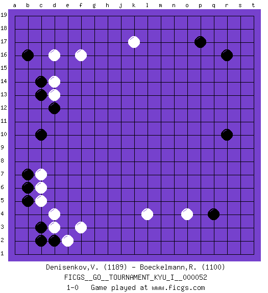 Last move : 1-0 2014 April 5 7:22:25 [Event "FICGS__GO__TOURNAMENT_KYU_I__000052 "] [Site "FICGS"] [Date "2014.02.17"] [Round "1"] [Black "Denisenkov,Valentin "] [White "Boeckelmann,Raik "] [Result "1-0"] [Rating 1 "1189"] [Rating 2 "1100"] 1.r16 d4 2.q4 d16 3.p17 o4 4.r10 l4 5.c10 k17 6.c14 f16 7.b16 d14 8.c13 d13 9.d12 c7 10.c3 d3 11.d2 e2 12.c2 f3 13.b5 c5 14.b6 c6 15.b7 1-0 This go game has been lost on time (started : 2014.02.17 8:50:9) Here are the names of the openings (joseki) played in the four corners : Corner q4 : q4 o4Hoshi (Hwajeom, Seongjeom, Xingwei`) 4-4 Point. The star or hoshi (4-4) point, emphasizing influence at the potential expense of territory.Ikken Takagakari (Hankan Nop'dakeolch'im, Yi Gaojia, 1-Space High Approach). Black typically responds at 6-4 or 3-10. Black 4-10 is played when Black finds play on the right side advantageous. Black 4-8 or 3-8 may be played when Black has support at top. Corner d16 : d16 c14Hoshi (Hwajeom, Seongjeom, Xingwei`) 4-4 Point. The star or hoshi (4-4) point, emphasizing influence at the potential expense of territory.Ikken Kakari (Hankan Keolch'im, Yi Gua`jiao~, 1-Space Low Approach). Black 2 is the standard approach move to the 4-4. Player Black won this Go (weiqi, baduk) game.Follow this game move after move (download ) Learning josekis by heart is useless if you don't try departing from them. (Pierre Audouard) The problem with manipulation is that people can turn on you. (Horatio Caine, C.S.I. Miami)
