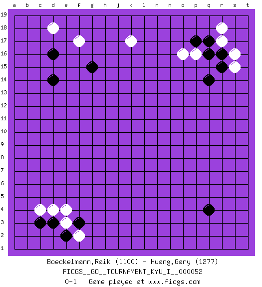 Last move : 0-1 2014 April 20 8:9:53 [Event "FICGS__GO__TOURNAMENT_KYU_I__000052 "] [Site "FICGS"] [Date "2014.02.17"] [Round "1"] [Black "Boeckelmann,Raik "] [White "Huang,Gary "] [Result "0-1"] [Rating 1 "1100"] [Rating 2 "1277"] 1.d16 e3 2.r16 p16 3.q14 r17 4.q4 s16 5.r15 s15 6.q17 r18 7.p17 o16 8.q16 f17 9.d14 k17 10.g15 d18 11.d3 d4 12.c3 c4 13.e2 f2 14.f3 e4 0-1 This go game has been lost on time (started : 2014.02.17 8:50:9) Here are the names of the openings (joseki) played in the four corners : Corner q16 : r16 p16Komoku (Somok, Xiao~mu`) 3-4 Point. The komoku (3-4) point is the traditional corner enclosure move..Ikken Takagakari (Hankan Nop'dakeolch'im, Yi Gaogua`jiao~, 1-Space High Approach). The 5-4 approach move has become more popular in modern times, as modern Go emphasizes speed and influence. Corner d16 : d16 f17Hoshi (Hwajeom, Seongjeom, Xingwei`) 4-4 Point. The star or hoshi (4-4) point, emphasizing influence at the potential expense of territory.Ikken Kakari (Hankan Keolch'im, Yi Gua`jiao~, 1-Space Low Approach). White 2 is the standard approach move to the 4-4. Corner d4 : e3 d3Mokuhazushi (Waemok, Wai`mu`) 5-3 Point. The mokuhazushi (5-3) point was popular in the Edo period in Japan (1600 - 1867). It emphasizes influence; territorially, it is inferior to the 3-4 point. Player White won this Go (weiqi, baduk) game.Follow this game move after move (download ) If your stone is capped, play the knight's move. (Anonymous) Perception is reality. (Immanuel Kant)