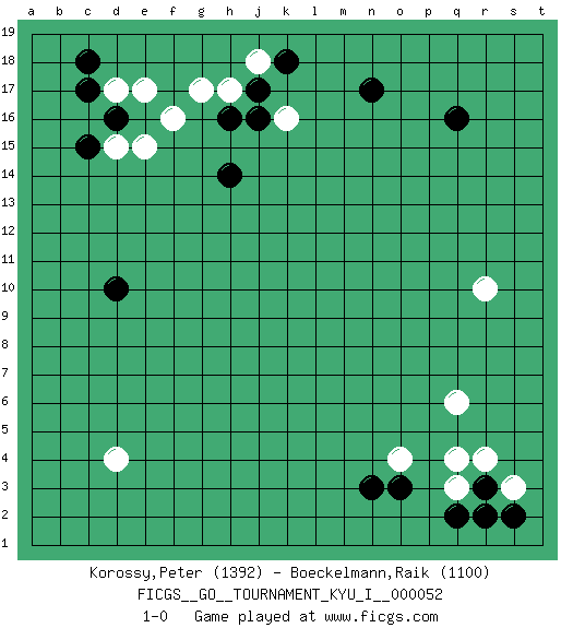 Last move : 1-0 2014 April 14 7:49:45 [Event "FICGS__GO__TOURNAMENT_KYU_I__000052 "] [Site "FICGS"] [Date "2014.02.17"] [Round "1"] [Black "Korossy,Peter "] [White "Boeckelmann,Raik "] [Result "1-0"] [Rating 1 "1392"] [Rating 2 "1100"] 1.q16 d4 2.d16 q4 3.o3 q6 4.r3 k16 5.d10 q3 6.q2 r4 7.s2 s3 8.r2 o4 9.n3 r10 10.n17 f16 11.h16 d17 12.c17 e17 13.c18 d15 14.c15 e15 15.h14 h17 16.j17 g17 17.j16 j18 18.k18 1-0 This go game has been lost on time (started : 2014.02.17 8:50:9) Here are the names of the openings (joseki) played in the four corners : Corner q4 : q4 o3Hoshi (Hwajeom, Seongjeom, Xingwei`) 4-4 Point. The star or hoshi (4-4) point, emphasizing influence at the potential expense of territory.Ikken Kakari (Hankan Keolch'im, Yi Gua`jiao~, 1-Space Low Approach). Black 2 is the standard approach move to the 4-4. Corner d16 : d16 f16Hoshi (Hwajeom, Seongjeom, Xingwei`) 4-4 Point. The star or hoshi (4-4) point, emphasizing influence at the potential expense of territory.Ikken Takagakari (Hankan Nop'dakeolch'im, Yi Gaojia, 1-Space High Approach). Black typically responds at 6-4 or 3-10. Black 4-10 is played when Black finds play on the right side advantageous. Black 4-8 or 3-8 may be played when Black has support at top. Player Black won this Go (weiqi, baduk) game.Follow this game move after move (download ) Five liberties for tactical stability. (Anonymous) May the force be with you. (Han Solo in Star Wars ep.4)