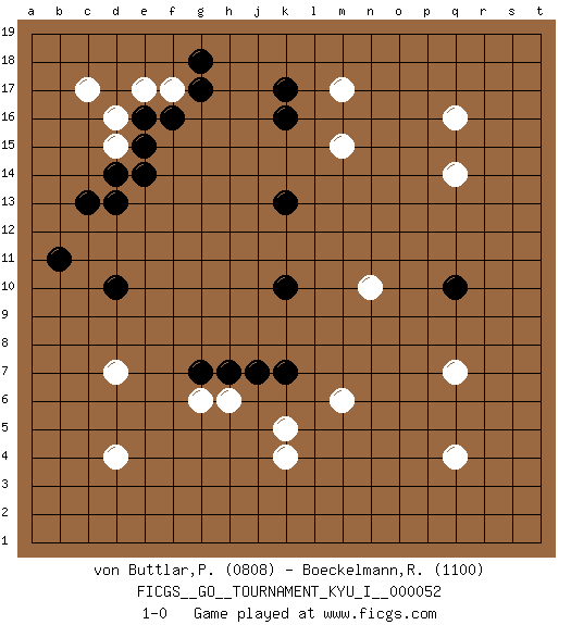 Last move : 1-0 2014 April 22 20:17:35 [Event "FICGS__GO__TOURNAMENT_KYU_I__000052"] [Site "FICGS"] [Date "2014.02.17"] [Round "1"] [Black "von Buttlar,Paul"] [White "Boeckelmann,Raik"] [Result "1-0"] [Rating 1 "0808"] [Rating 2 "1100"] 1.d10 q4 2.k16 d4 3.k10 d16 4.q10 q16 5.e15 d15 6.e14 f17 7.e16 e17 8.d14 k4 9.d13 q14 10.g17 c17 11.f16 m17 12.k17 m15 13.k13 d7 14.c13 q7 15.k7 k5 16.b11 n10 17.g18 h6 18.j7 m6 19.h7 g6 20.g7 1-0 This go game has been lost on time (started : 2014.02.17 8:50:9) Here are the names of the openings (joseki) played in the four corners : Corner d16 : d16 e15 Hoshi (Hwajeom, Seongjeom, Xingwei`) 4-4 Point. The star or hoshi (4-4) point, emphasizing influence at the potential expense of territory. Player Black won this Go (weiqi, baduk) game. Follow this game move after move (download)In the sound of the stone you can hear its purpose. (Pierre Audouard) Have no fear of perfection - you'll never reach it. (Salvador Dali)