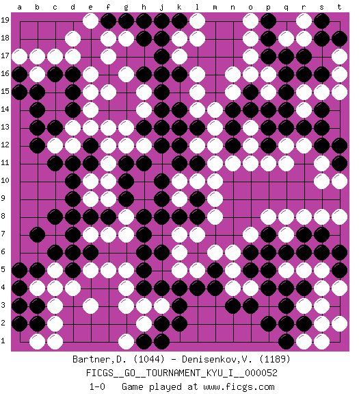 Last move : 1-0 2014 February 25 12:35:59 [Event "FICGS__GO__TOURNAMENT_KYU_I__000052"] [Site "FICGS"] [Date "2014.02.17"] [Round "1"] [Black "Bartner,Douglas"] [White "Denisenkov,Valentin"] [Result "1-0"] [Rating 1 "1044"] [Rating 2 "1189"] 1.q16 c4 2.q4 d17 3.n3 o17 4.r13 q18 5.r17 l16 6.j17 k17 7.j16 f17 8.c11 c14 9.c8 e3 10.d15 c15 11.d16 c17 12.c16 b16 13.d14 b17 14.c13 f15 15.j14 f13 16.b13 e16 17.b15 l14 18.h13 h15 19.j15 f11 20.k12 m12 21.h11 k13 22.j12 g12 23.j10 h14 24.j13 l10 25.g9 f9 26.f8 g8 27.h8 g7 28.g10 f10 29.h7 f7 30.e8 r8 31.r6 q11 32.p13 o11 33.k3 h3 34.h6 e7 35.d8 k5 36.j4 n5 37.h4 g3 38.m4 o7 39.l8 m8 40.l9 m9 41.p4 l7 42.c6 e5 43.o15 r18 44.s18 r15 45.r16 s15 46.s13 p16 47.q15 p15 48.p14 n16 49.p17 o16 50.p18 o18 51.q17 k10 52.j9 k9 53.k8 k7 54.j8 s11 55.b5 b4 56.a4 a3 57.a5 c5 58.b7 d12 59.d11 d13 60.b3 c3 61.b2 c2 62.s7 s8 63.j18 k18 64.f19 f18 65.g19 s5 66.s6 r3 67.q3 q2 68.p2 s2 69.q1 s4 70.r2 s1 71.t3 t2 72.r4 s3 73.q6 q7 74.m5 m6 75.n14 e14 76.b14 e19 77.h18 g18 78.h19 d18 79.l13 m13 80.k14 m14 81.l11 m11 82.k11 m10 83.e11 g13 84.e12 e13 85.g11 f12 86.j2 h2 87.k4 l5 88.l4 g4 89.o6 n6 90.p7 p8 91.p6 o4 92.o3 n15 93.n13 o12 94.n12 n11 95.r7 q8 96.s12 q12 97.q13 o13 98.o14 o19 99.p19 c12 100.b12 b1 101.a2 j3 102.k2 r5 103.t11 s10 104.o5 n4 105.k19 l19 106.j19 t10 107.k16 l18 108.h16 g16 109.d6 f5 110.d5 d4 111.h1 g1 112.j1 q5 113.p5 e9 114.d9 l12 115.j6 k6 116.k13 h12 117.d7 e15 118.t12 r1 119.q2 e10 120.d10 r12 121.p12 p11 122.a16 a17 123.a15 t8 124.t5 t4 125.t6 l15 126.e6 g5 127.h5 c1 128.a3 r14 129.q14 t16 130.s16 t17 131.s14 t15 132.t18 r19 133.s19 pass 134.pass pass 135.pass 1-0 Comment by player 1 : Douglas Bartner : See above. First you remove dead stones and then score. I counted manually too to make sure B won. Thanks for the game, good one. Comment by player 2 : Valentin Denisenkov : Thank you for the game. I counted B+0.5 (with komi 7.5). So close:( Here are the names of the openings (joseki) played in the four corners : Corner q16 : q16 o17 Hoshi (Hwajeom, Seongjeom, Xingwei`) 4-4 Point. The star or hoshi (4-4) point, emphasizing influence at the potential expense of territory. Ikken Kakari (Hankan Keolch'im, Yi Gua`jiao~, 1-Space Low Approach). White 2 is the standard approach move to the 4-4. Corner d16 : d17 j17 Komoku (Somok, Xiao~mu`) 3-4 Point. The komoku (3-4) point is the traditional corner enclosure move.. Corner d4 : c4 c8 Komoku (Somok, Xiao~mu`) 3-4 Point. The komoku (3-4) point is the traditional corner enclosure move.. Player Black won this Go (weiqi, baduk) game. Follow this game move after move (download)If there is no stone on the handicap point, the carpenter's square is dead. (Anonymous) Better than a thousand days of diligent study is one day with a great teacher. (Japanese proverb)