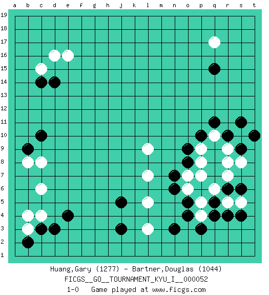 Last move : 1-0 2014 March 31 12:15:24 [Event "FICGS__GO__TOURNAMENT_KYU_I__000052"] [Site "FICGS"] [Date "2014.02.17"] [Round "1"] [Black "Huang,Gary"] [White "Bartner,Douglas"] [Result "1-0"] [Rating 1 "1277"] [Rating 2 "1044"] 1.q15 d16 2.c14 c15 3.d14 e16 4.c10 c4 5.e4 c6 6.c3 b3 7.d3 c8 8.b9 b8 9.b2 b4 10.r4 l3 11.n3 q6 12.j3 l5 13.o5 r5 14.q4 r8 15.j5 l7 16.o8 l9 17.r10 s10 18.s9 r9 19.s11 s8 20.t10 o6 21.n6 o7 22.n7 p5 23.o4 p4 24.p3 p7 25.q5 q17 26.r6 s5 27.s6 p8 28.o9 p9 29.p10 r7 30.s4 q10 31.q11 1-0 Here are the names of the openings (joseki) played in the four corners : Corner d16 : d16 c14 Hoshi (Hwajeom, Seongjeom, Xingwei`) 4-4 Point. The star or hoshi (4-4) point, emphasizing influence at the potential expense of territory. Ikken Kakari (Hankan Keolch'im, Yi Gua`jiao~, 1-Space Low Approach). Black 2 is the standard approach move to the 4-4. Corner d4 : c4 e4 Komoku (Somok, Xiao~mu`) 3-4 Point. The komoku (3-4) point is the traditional corner enclosure move.. Ikken Takagakari (Hankan Nop'dakeolch'im, Yi Gaogua`jiao~, 1-Space High Approach). The 5-4 approach move has become more popular in modern times, as modern Go emphasizes speed and influence. Corner q4 : r4 l3 Komoku (Somok, Xiao~mu`) 3-4 Point. The komoku (3-4) point is the traditional corner enclosure move.. Player Black won this Go (weiqi, baduk) game. Follow this game move after move (download)Big groups never die. (Anonymous) Humor is by far the most significant activity of the human brain. (Edward De Bono)
