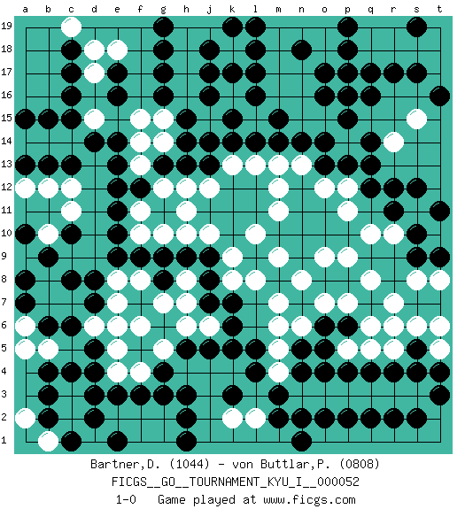 Last move : 1-0 2014 May 25 20:8:28 [Event "FICGS__GO__TOURNAMENT_KYU_I__000052"] [Site "FICGS"] [Date "2014.02.17"] [Round "1"] [Black "Bartner,Douglas"] [White "von Buttlar,Paul"] [Result "1-0"] [Rating 1 "1044"] [Rating 2 "0808"] 1.q16 q10 2.r4 q6 3.p4 n6 4.n4 m4 5.n5 m5 6.o6 o7 7.p6 p7 8.m3 l3 9.m2 l2 10.d3 m1 11.n2 o3 12.o4 n3 13.o2 p3 14.p2 q3 15.q4 r3 16.r2 s3 17.s2 s4 18.s5 t5 19.q2 k1 20.t3 r6 21.r12 t6 22.t4 s6 23.s10 q8 24.g3 r7 25.c16 p5 26.o5 q5 27.q14 n8 28.c10 p9 29.e17 o9 30.k17 p11 31.c6 m7 32.e10 l8 33.k15 m9 34.o17 k9 35.c13 l10 36.g16 m11 37.m14 m13 38.n14 n13 39.o14 j12 40.h14 g10 41.f12 e6 42.d5 e5 43.e3 f4 44.g4 g5 45.f9 f6 46.g9 h10 47.d8 e8 48.e9 f8 49.g8 g7 50.f3 e4 51.d4 h6 52.h13 e7 53.d7 h4 54.h3 j4 55.o13 m12 56.q12 p12 57.q13 o12 58.k14 k13 59.r17 f11 60.e12 g12 61.g13 f10 62.e11 h12 63.c17 j3 64.r11 r10 65.s9 s8 66.l14 l13 67.h2 j2 68.j8 h8 69.h9 h7 70.j9 j10 71.h1 j1 72.j13 h11 73.p13 s11 74.s12 d6 75.n1 l1 76.t9 t8 77.t11 c7 78.c8 b7 79.b6 b8 80.b9 a6 81.a8 b5 82.a7 a5 83.b3 c3 84.c4 c2 85.b2 b1 86.b4 n16 87.o16 n17 88.l18 r5 89.s4 o18 90.p18 m18 91.l16 o19 92.p19 m19 93.l19 m16 94.k7 k8 95.j7 f13 96.d14 o15 97.p15 n15 98.d2 k18 99.j18 j19 100.k19 p17 101.p16 h19 102.g19 h18 103.g18 h17 104.g17 h16 105.h15 j15 106.j16 c12 107.b13 b12 108.k5 f14 109.e14 f15 110.e16 g15 111.j5 g14 112.j14 a2 113.c1 d17 114.h5 j6 115.k6 m17 116.m15 c14 117.e13 d15 118.c15 b14 119.b15 a14 120.a15 a12 121.a13 c11 122.l4 k4 123.l5 m6 124.k3 k2 125.k3 d18 126.j17 e18 127.l17 q18 128.q17 q19 129.p17 r18 130.n18 n19 131.n18 s18 132.s17 t17 133.t16 t18 134.s19 s15 135.t19 r19 136.s19 t19 137.s19 d1 138.e1 r14 139.c18 c19 140.pass b10 141.a10 k2 142.pass l2 143.pass 1-0 Here are the names of the openings (joseki) played in the four corners : Corner q4 : r4 q6 Komoku (Somok, Xiao~mu`) 3-4 Point. The komoku (3-4) point is the traditional corner enclosure move.. Player Black won this Go (weiqi, baduk) game. Follow this game move after move (download)Be a little patient. Keshi works ! (Anonymous) All the troubles of the world come from being unable to sit alone in a quiet room. (Blaise Pascal)