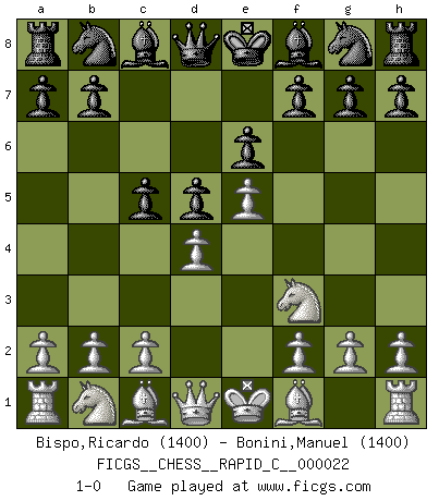 Last move : 1-0 2007 March 19 13:26:35 [Event "FICGS__CHESS__RAPID_C__000022"] [Site "FICGS"] [Date "2007.02.12"] [Round "1"] [White "Bispo,Ricardo"] [Black "Bonini,Manuel"] [Result "1-0"] [WhiteElo "1400"] [BlackElo "1400"] 1.e4 e6 2.d4 d5 3.e5 c5 4.Nf3 1-0 This chess game has been lost on time (started : 2007.02.12 23:3:27) French : Advance, Nimzovich system Player White won this chess game. Follow this game move after move (download)If cunning alone were needed to excel, women would be the best Chess players. (Albin) Zeige mir drei Eröffnungsvarianten und ich beweise dir, dass zwei davon inkorrekt sind. (Emanuel Lasker) Debió haber existido una vez en que los hombres eran semidióses, de otra manera no hubiesen podido inventar el Ajedrez. (Gustav Schenk) La vie et les Echecs sont tous les deux une lutte constante. (Lasker) In my experience, there's no such thing as luck. (Obi-Wan Kenobi in Star Wars ep.4)