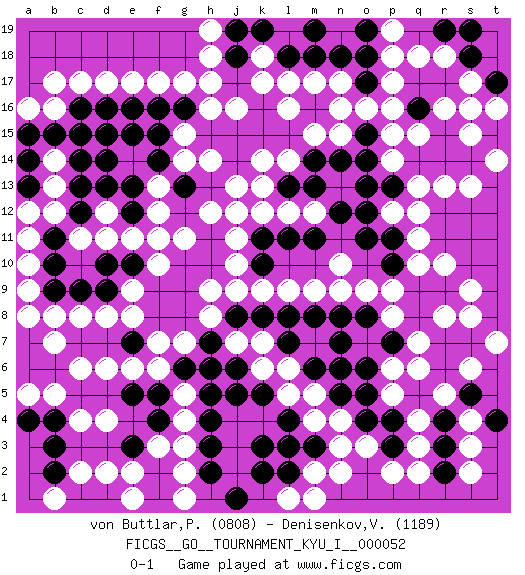 Last move : 0-1 2014 May 13 22:9:51 [Event "FICGS__GO__TOURNAMENT_KYU_I__000052"] [Site "FICGS"] [Date "2014.02.17"] [Round "1"] [Black "von Buttlar,Paul"] [White "Denisenkov,Valentin"] [Result "0-1"] [Rating 1 "0808"] [Rating 2 "1189"] 1.d10 r16 2.k16 p17 3.k10 c17 4.d16 d17 5.d15 f17 6.f16 g17 7.g16 d4 8.c16 h17 9.j17 h16 10.h15 j16 11.j15 k17 12.j18 k18 13.k19 h18 14.j19 l19 15.l18 h19 16.m19 l16 17.k15 q3 18.k19 m17 19.n18 n17 20.o17 o16 21.o18 p18 22.o19 p19 23.m16 m15 24.l15 l17 25.m14 n15 26.m18 r5 27.o15 p15 28.o14 p14 29.n14 n16 30.q16 q15 31.j19 q10 32.q14 q13 33.r14 r13 34.s14 s13 35.t15 s16 36.r15 s15 37.q17 p16 38.r17 s17 39.s18 r18 40.p13 p12 41.o13 k4 42.p11 q11 43.o12 q12 44.o11 c6 45.g8 g3 46.m6 n4 47.o6 o9 48.p10 p9 49.o8 n9 50.n8 m9 51.m8 l9 52.l8 k9 53.k8 j9 54.j8 h9 55.g9 h8 56.h7 g7 57.g6 f7 58.h10 j7 59.h6 k6 60.j6 k7 61.k5 l5 62.j5 l6 63.l4 m4 64.l3 m5 65.o4 o3 66.o5 n3 67.k3 j4 68.h4 j3 69.h3 j2 70.h2 g5 71.f5 f6 72.h5 g4 73.k2 g2 74.j1 q7 75.q8 p8 76.p7 q6 77.q9 r8 78.r19 q18 79.t17 j10 80.r9 s9 81.e16 j11 82.k11 k12 83.l11 h12 84.g10 l12 85.m11 m12 86.n12 l14 87.l13 k14 88.j14 k13 89.m13 n10 90.h13 j12 91.g12 d8 92.f8 e8 93.e7 e6 94.d9 c8 95.c9 b8 96.h11 r10 97.e5 d6 98.f4 f3 99.p3 p2 100.p4 q2 101.n5 m7 102.n6 m2 103.m3 n2 104.f2 e2 105.f1 g1 106.d1 d2 107.e3 e1 108.c1 c2 109.s19 t16 110.q16 t14 111.s7 e9 112.e10 b16 113.b15 b17 114.a15 e17 115.c14 a11 116.b9 a9 117.b10 a10 118.a7 a8 119.b6 b7 120.a6 b5 121.b11 b12 122.c12 b13 123.c13 f10 124.f9 g11 125.f11 f12 126.g13 e11 127.e12 d12 128.e13 c11 129.r6 s6 130.r7 t7 131.s5 s8 132.r4 q4 133.r3 s4 134.t4 s3 135.r2 s2 136.q5 p5 137.l7 p6 138.n7 f11 139.j18 f13 140.f14 e14 141.d13 d11 142.a13 g14 143.f15 j13 144.e15 a12 145.a14 b14 146.d14 a16 147.c15 h14 148.b2 b1 149.b3 c4 150.b4 a5 151.a4 l1 152.l2 m1 153.g13 g15 0-1 Here are the names of the openings (joseki) played in the four corners : Corner d16 : c17 d16 San-San (Sam-Sam, San-San) 3-3 Point. The San-San (3-3) point, emphasizing territory at the expense of influence. Kata-tsuki (shoulder hit). The shoulder-hit is the traditional answer to the 3-3. The direction of White 3 depends on the positions on the side. Crawling once may be the premise for a follow-up move of sliding with a knight's move in the opposite direction. If White plays 3 at 3-4 (to the right), the follow-on knight's move is then played at the top (e.g. 3-4, 4-5, 5-2). White's knight's move reduces territory potential on the side it is played. Player White won this Go (weiqi, baduk) game. Follow this game move after move (download)The L-group is dead. (Anonymous) Heh, heh, heh. Time to abandon ship. (General Grievous in Star Wars ep.3)