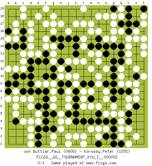 Last move : 0-1 2014 November 26 11:48:39 [Event "FICGS__GO__TOURNAMENT_KYU_I__000052"] [Site "FICGS"] [Date "2014.02.17"] [Round "1"] [Black "von Buttlar,Paul"] [White "Korossy,Peter"] [Result "0-1"] [Rating 1 "0808"] [Rating 2 "1392"] 1.d10 d4 2.f8 k10 3.d5 e4 4.f5 e5 5.f6 d7 6.e6 d6 7.c5 c4 8.c6 c7 9.b7 b8 10.c8 b5 11.b4 b6 12.d8 d13 13.f10 g12 14.e12 e13 15.b9 a7 16.a9 c11 17.c10 b11 18.e8 d16 19.f7 j7 20.b10 q16 21.d12 c12 22.d11 q4 23.f13 c13 24.f12 f15 25.e14 f14 26.f16 j16 27.e16 d17 28.e17 g17 29.g15 g14 30.h15 g13 31.h14 g16 32.e15 d15 33.d18 c18 34.d19 c19 35.f18 g18 36.g19 h19 37.h18 f19 38.c14 d14 39.j19 e18 40.e19 e18 41.g19 f17 42.j17 k17 43.k18 l17 44.l18 n18 45.m18 m17 46.n19 o18 47.h19 h17 48.j18 q10 49.n17 n16 50.o17 p17 51.o16 o15 52.f4 j4 53.n15 m16 54.o14 p15 55.p18 p16 56.o19 q18 57.p19 g9 58.g11 h11 59.g10 h10 60.h9 g8 61.h8 g7 62.e3 d3 63.f3 h3 64.r18 q19 65.m19 r6 66.j15 g6 67.a8 b7 68.g5 h5 69.e2 d2 70.e1 d1 71.g3 g2 72.h2 j2 73.h1 g1 74.k1 k2 75.j5 h4 76.k4 j6 77.k5 m3 78.l4 l2 79.k6 m6 80.k7 l8 81.m4 n3 82.n4 o5 83.o4 o3 84.p4 p5 85.p3 q3 86.p2 q2 87.q1 r1 88.p1 s2 89.o2 n2 90.n5 n6 91.k8 k9 92.n1 l1 93.m7 l7 94.o6 l6 95.j9 j8 96.j11 j10 97.p14 r13 98.q14 r14 99.q13 r12 100.q12 q11 101.p12 n13 102.n14 m13 103.p11 n10 104.p10 q9 105.p9 o8 106.p8 p6 107.p7 o7 108.o13 n12 109.q8 s8 110.r8 s9 111.r10 r9 112.r11 r7 113.o9 n9 114.m14 l14 115.n11 m11 116.s12 s11 117.s13 r15 118.s14 s15 119.t11 t10 120.t12 t14 121.s10 s11 122.s10 t13 123.r17 l19 124.k19 f9 125.l9 e9 126.d9 j1 127.h12 j12 128.r19 l19 129.r16 t17 130.t16 s16 131.q17 a11 132.b14 o11 133.c15 b16 134.c16 b17 135.a14 a15 136.a16 b15 137.p19 p18 138.s17 t18 139.t19 t15 140.k15 l15 141.k14 k12 142.k13 l12 143.r5 q5 144.r4 r3 145.m9 m8 146.s6 s7 0-1 This go game has been lost on time (started : 2014.02.17 8:50:9) Here are the names of the openings (joseki) played in the four corners : Corner d4 : d4 f8 Hoshi (Hwajeom, Seongjeom, Xingwei`) 4-4 Point. The star or hoshi (4-4) point, emphasizing influence at the potential expense of territory. Player White won this Go (weiqi, baduk) game. Follow this game move after move (download)Knight's moves win running battles. (Anonymous) Begin at the beginning and go on till you come to the end; then stop. (Lewis Carrol, Alice in Wonderland)