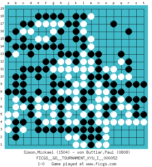 Last move : 1-0 2014 November 6 22:13:25 [Event "FICGS__GO__TOURNAMENT_KYU_I__000052"] [Site "FICGS"] [Date "2014.02.17"] [Round "1"] [Black "Simon,Mickael"] [White "von Buttlar,Paul"] [Result "1-0"] [Rating 1 "1504"] [Rating 2 "0808"] 1.r16 q10 2.d17 o11 3.c4 q4 4.e3 n6 5.k10 n8 6.c10 k7 7.k3 k4 8.j3 j4 9.l4 l5 10.m4 n4 11.m5 m6 12.h4 l3 13.m3 n5 14.n3 o3 15.l2 j5 16.h5 j6 17.k17 o2 18.p17 m2 19.n2 p4 20.r12 q12 21.r11 r10 22.q13 j10 23.c15 k11 24.l11 l12 25.k12 j11 26.n11 m11 27.n12 l10 28.n10 k9 29.o9 n9 30.o10 p10 31.p8 o8 32.p9 p11 33.n13 n1 34.m1 o1 35.r7 q7 36.q8 r8 37.r9 s8 38.s9 r6 39.s7 j12 40.s6 r5 41.s5 s4 42.k13 l13 43.l14 k14 44.j13 j14 45.h13 g13 46.h14 j15 47.g14 h12 48.f14 f13 49.e14 e13 50.d13 d12 51.d14 c12 52.f11 e12 53.e10 b12 54.g12 g11 55.f12 f10 56.e11 e9 57.c11 b11 58.b10 c13 59.b14 a10 60.b9 d10 61.d11 d9 62.c8 a9 63.a8 a11 64.h6 b7 65.b8 d8 66.c7 c6 67.d7 e7 68.d6 e6 69.d5 e5 70.h7 h8 71.g8 f8 72.g9 h15 73.l15 j16 74.j17 h17 75.h18 g17 76.g18 f17 77.f18 e17 78.e18 d16 79.c17 e15 80.g15 b13 81.c14 m12 82.m13 l16 83.k16 c16 84.b16 f15 85.m10 l11 86.m9 n7 87.p7 q6 88.l8 k8 89.l6 t8 90.t9 k1 91.j7 k6 92.l7 l9 93.m8 j8 94.h9 f9 95.g10 h11 96.f7 f6 97.g7 g6 98.e4 f4 99.f3 g4 100.g3 g5 101.c9 b6 102.e8 a14 103.a13 a12 104.a13 b5 105.o6 o7 106.p6 p5 107.o5 o4 108.t7 t4 109.t5 r4 110.j9 l1 111.m2 j2 112.h3 k2 113.l3 c3 114.b4 a4 115.b3 a3 116.b2 a5 117.pass m15 118.k15 l17 119.h16 g16 120.pass m14 121.l18 b13 122.a15 m18 123.k18 1-0 This go game has been lost on time (started : 2014.02.17 8:50:9) Here are the names of the openings (joseki) played in the four corners : Corner q16 : r16 o11 Komoku (Somok, Xiao~mu`) 3-4 Point. The komoku (3-4) point is the traditional corner enclosure move.. Player Black won this Go (weiqi, baduk) game. Follow this game move after move (download)Go uses the most elemental materials and concepts - line and circle, wood and stone, black and white - combining them with simple rules to generate subtle strategies and complex tactics that stagger the imagination. (Iwamoto Kaoru, 9 dan professional Go player and former Honinbo title holder) As the days dwindle down... to a precious few. (Maxwell Anderson)