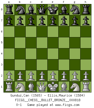 Last move : 0-1 2014 February 19 1:20:51 [Event "FICGS__CHESS__BULLET_BRONZE__000818"] [Site "FICGS"] [Date "2014.02.18"] [Round "1"] [White "Gunduz,Can"] [Black "Ellis,Maurice"] [Result "0-1"] [WhiteElo "1565"] [BlackElo "1584"] 0-1 This chess game has been lost on time (started : 2014.02.18 21:27:23) Player Black won this chess game. Follow this game move after move (download)On the chessboard, lies and hypocrisy do not survive long. (Emanuel Lasker) Ich verstehe Aljechins Kombinationen ganz gut; aber woher er diese Angriffschancen bekommt und wie er die Eröffnung behandelt das ist für mich ein Buch mit sieben Siegeln. (Rudolf Spielmann) No solamente yo pronostico su triunfo sobre Botvinnik, sino que me adelanto y digo que probablemente Fischer es el jugador de Ajedrez mas grande que haya existido. (John Collins) Toute estimation doit être constamment réévaluée. (Jacob Estrin) There is far too much law for those who can afford it and far too little for those who cannot. (Derek Bok)