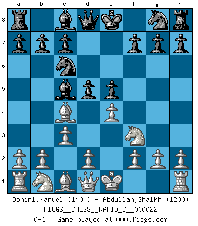 Last move : 0-1 2007 March 19 7:26:17 [Event "FICGS__CHESS__RAPID_C__000022"] [Site "FICGS"] [Date "2007.02.12"] [Round "1"] [White "Bonini,Manuel"] [Black "Abdullah,Shaikh"] [Result "0-1"] [WhiteElo "1400"] [BlackElo "1200"] 1.e4 e5 2.Nf3 Nc6 3.Bc4 Bc5 4.c3 d5 0-1 This chess game has been lost on time (started : 2007.02.12 23:3:27) Giuoco Piano Player Black won this chess game. Follow this game move after move (download)My God, Bobby Fischer plays so simply. (Alexei Suetin) Wenn ich mich einlogge, glauben die Leute gewöhnlich nicht, dass ich es selbst bin und sie fangen an, mir dumme Fragen zu stellen. Und wenn sie es glauben, stellen sie wieder andere dumme Fragen. (Judith Polgar) Si no le temes a Spassky, entonces elimino el elemento del dinero. (Jim Slater) Seul un grand joueur sait à quel point il joue faiblement. (Xavier Tartacover) It is not titles that honor men, but men that honor titles. (Niccolo Machiavelli)