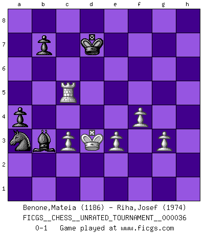 Last move : 0-1 2014 April 18 11:5:33 [Event "FICGS__CHESS__UNRATED_TOURNAMENT__000036"] [Site "FICGS"] [Date "2014.02.19"] [Round "1"] [White "Benone,Mateia"] [Black "Riha,Josef"] [Result "0-1"] [WhiteElo "1186"] [BlackElo "1974"] 1.Nf3 d5 2.d4 e6 3.c4 Nd7 4.Nc3 Ngf6 5.Bg5 h6 6.Bh4 g5 7.Bg3 Ne4 8.cxd5 exd5 9.Nxd5 Nxg3 10.hxg3 c6 11.Nc3 Qb6 12.Qb3 g4 13.Qxb6 Nxb6 14.Nd2 Be6 15.e3 O-O-O 16.O-O-O c5 17.dxc5 Bxc5 18.Rh5 Bb4 19.a3 Bxc3 20.bxc3 Kb8 21.Ne4 Rxd1+ 22.Kxd1 Rc8 23.Kc2 a6 24.Rxh6 Na4 25.Bd3 Bf5 26.Kd2 Nb2 27.Rf6 Bg6 28.Nd6 Bxd3 29.Nxc8 Kxc8 30.Rxf7 Nc4+ 31.Kd1 Nxa3 32.Rf4 Bf1 33.Rxg4 Bxg2 34.Ke2 Bd5 35.Rg5 Bc4+ 36.Kd2 Bb3 37.f4 a5 38.Rc5+ Kd7 39.Kd3 a4 0-1 Reti Opening Queenside Castling by player Black (move 15) Queenside Castling by player White (move 16) Player Black won this chess game. Follow this game move after move (download)You may learn much more from a game you lose than from a game you win. You will have to lose hundreds of games before becoming a good player. (Jose Raul Capablanca) Konzentriere dich auf materielle Gewinne. Nimm, was dir dein Gegner gibt, ausser es gibt einen guten Grund der dagegenspricht. (Robert James Fischer) Combinaciones deslumbrantes son para la mayoría, mover madera es para los pocos. (Georg Kieninger) Toutes choses étant égales, c'est la conviction qui gagne. Alliée à une volonté de vaincre, elle sert de détonateur, suscite des idées, disperse les doutes et aide à penser clairement. (Robert Fischer) Information on the Internet is subject to the same rules and regulations as conversation at a bar. (George Lundberg)