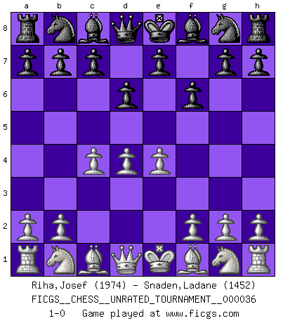 Last move : 1-0 2014 April 1 7:5:31 [Event "FICGS__CHESS__UNRATED_TOURNAMENT__000036"] [Site "FICGS"] [Date "2014.02.19"] [Round "1"] [White "Riha,Josef"] [Black "Snaden,Ladane"] [Result "1-0"] [WhiteElo "1974"] [BlackElo "1452"] 1.d4 d6 2.c4 f6 3.e4 1-0 This chess game has been lost on time (started : 2014.02.19 3:7:2) Old Indian defense Player White won this chess game. Follow this game move after move (download)I had a toothache during the first game. In the second game I had a headache. In the third game it was an attack of rheumatism. In the fourth game, I wasn't feeling well. And in the fifth game? Well, must one have to win every game ? (Siegbert Tarrasch) Eine Person mit durchschnittlichem IQ kann etwa eine ELO von 2000 erreichen. (Jonathan Levitt) En un gambito tu regalas un Peón por el bién de tomar un juego perdido. (Samuel Standige Boden) Le plus grand jeu de l'esprit jamais inventé, plus vous l'apprenez, plus vous y prenez du plaisir. (Garry Kasparov) Shallow men believe in luck. Strong men belive in cause and effect. (Ralph Waldo Emerson)