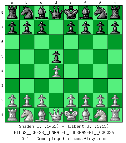 Last move : 0-1 2014 April 17 7:53:35 [Event "FICGS__CHESS__UNRATED_TOURNAMENT__000036"] [Site "FICGS"] [Date "2014.02.19"] [Round "1"] [White "Snaden,Ladane"] [Black "Hilbert,Stephan J."] [Result "0-1"] [WhiteElo "1452"] [BlackElo "1713"] 1.d4 d5 0-1 This chess game has been lost on time (started : 2014.02.19 3:7:2) Queen's pawn game Player Black won this chess game. Follow this game move after move (download)The King is a fighting piece. Use it ! (Wilhelm Steinitz) Es hat in meinem Leben Zeiten gegeben, in denen das Schachspiel, wenn nicht zum Lebenszweck, so doch zu einem regelrechten Lebensersatz geworden ist. Man fühlt sich in solchen Zeiten nicht so, als besäße man eine göttliche Gabe, sondern eher so, als sei man von ihr besessen. (Garry Kasparov) Si tu oponente te ofrece un empate, trata de averiguar porque piensa él que esta en una posición peor. (Nigel Short) Dieu déplace le joueur, et celui-ci la pièce. Quel Dieu derrière Dieu commence donc la trame ? Arturo Perez-Reverte (prix de littérature policière 1993). We need strong personalities and only one world champion to attract sponsors. (Anatoly Karpov)
