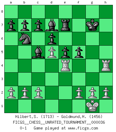 Last move : 0-1 2014 March 16 15:59:45 [Event "FICGS__CHESS__UNRATED_TOURNAMENT__000036"] [Site "FICGS"] [Date "2014.02.19"] [Round "1"] [White "Hilbert,Stephan J."] [Black "Goldmund,Heike"] [Result "0-1"] [WhiteElo "1713"] [BlackElo "1456"] 1.Nc3 e5 2.e4 Nf6 3.Nf3 Bc5 4.Bc4 O-O 5.O-O Re8 6.Ng5 Re7 7.Nd5 Nxd5 8.exd5 d6 9.Qh5 h6 10.d4 Bxd4 11.Nf3 Bc5 12.Re1 Nd7 13.Bxh6 gxh6 14.Qxh6 f6 15.Nh4 Rh7 16.Qg6+ Kh8 17.Nf5 Qg8 18.Ne7 Qxg6 19.Nxg6+ Kg7 20.Ne7 Nb6 21.Bd3 Bd7 22.Bxh7 Kxh7 23.Re4 Re8 24.Rh4+ Kg7 25.Re1 Rxe7 26.R1e4 f5 0-1 Dunst (Sleipner-Heinrichsen) Opening Kingside Castling by player Black (move 4) Kingside Castling by player White (move 5) Player Black won this chess game. Follow this game move after move (download)Chess is above all, a fight ! (Emanuel Lasker) Ich verlor meine Bürgerrechte, mein Gehalt wurde mir nicht mehr bezahlt und ich wurde zensiert und durfte nicht mehr ins Ausland reisen. [nach dem Match Fischer-Taimanov 6:0] (Mark Taimanov) Yo considero que Fischer es uno de los expertos mas grandes de aperturas de siempre. (Keith Hayward) Celui qui prend des risques peut perdre, celui qui n'en prend pas perd toujours. (Xavier Tartacover) You must have a dream in order to have it come true. (A.P.J. Kalam)