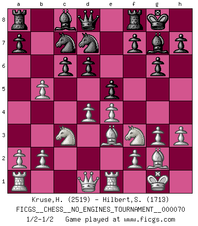 Last move : 1/2-1/2 2014 March 13 9:54:56 [Event "FICGS__CHESS__NO_ENGINES_TOURNAMENT__000070"] [Site "FICGS"] [Date "2014.02.19"] [Round "1"] [White "Kruse,Herbert"] [Black "Hilbert,Stephan J."] [Result "1/2-1/2"] [WhiteElo "2519"] [BlackElo "1713"] 1.g3 d6 2.d4 g6 3.Bg2 Bg7 4.Nf3 c6 5.c4 Nf6 6.O-O O-O 7.Nc3 Na6 8.e4 Nc7 9.h3 e5 10.Re1 Nd7 11.Be3 b5 12.cxb5 1/2-1/2 Benko's Opening Kingside Castling by player White (move 6) Kingside Castling by player Black (move 6) This chess game ended in a draw. Follow this game move after move (download)In order to improve your game, you must study the endgame before everything else, for whereas the endings can be studied and mastered by themselves, the middle game and the opening must be studied in relation to the endgame. (Jose Raul Capablanca) Fischer: 'Remis!?' Uhlmann: 'Aber es muss doch dreimal Zugwiederholung sein!' Fischer: 'Sie nehmen das Remis an, wie ich es sage, sonst spiele ich weiter und werde Sie dann schlagen!' (Robert James Fischer) Bobby es el jugador de Ajedrez mas fino que este país jamás haya producido. Su memoria para las movidas, su brillantez en soñar combinaciones y su feróz determinación por la victoria son algo extraño. (John Collins) Il n'y a plus de joueurs du niveau de Jacob Murray dont la seule quête est le beau jeu, le plaisir de voir les pièces construire quelque chose. Sur 10 idées à la minute, 9 seront sans intérêt, la dernière s'avèrera géniale. (Christian Bauer) There are more things in heaven and earth than practically anywhere else. (Unknown)