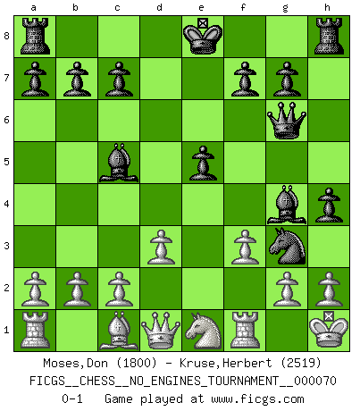 Last move : 0-1 2014 February 21 21:38:58 [Event "FICGS__CHESS__NO_ENGINES_TOURNAMENT__000070"] [Site "FICGS"] [Date "2014.02.19"] [Round "1"] [White "Moses,Don"] [Black "Kruse,Herbert"] [Result "0-1"] [WhiteElo "1800"] [BlackElo "2519"] 1.e4 Nf6 2.Nc3 e5 3.Bc4 Nc6 4.Nf3 Nxe4 5.Nxe4 d5 6.Bxd5 Qxd5 7.Nc3 Qd6 8.Ne4 Qg6 9.Ng3 h5 10.O-O h4 11.Ne2 Bg4 12.Ne1 Bc5 13.d3 Nd4 14.f3 Nxe2+ 15.Kh1 Ng3+ 0-1 Alekhine's defense Kingside Castling by player White (move 10) Player Black won this chess game. Follow this game move after move (download)The passed pawn is a criminal, who should be kept under lock and key. Mild measures, such as police surveillance, are not sufficient. (Nimzovitch) Wenn ich mich einlogge, glauben die Leute gewöhnlich nicht, dass ich es selbst bin und sie fangen an, mir dumme Fragen zu stellen. Und wenn sie es glauben, stellen sie wieder andere dumme Fragen. (Judith Polgar) Si el ingenio solamente fuese necesario para lucirse, las mujeres serían las mejores jugadoras de Ajedrez del mundo. (Albin) La victoire dans une partie d'Echecs appartient la plupart du temps à celui qui voit un peu plus loin que l'adversaire. (Lasker) Fear is the path to the dark side. Fear leads to anger; anger leads to hate; hate leads to suffering. I sense much fear in you. (Master Yoda in Star Wars ep.1)