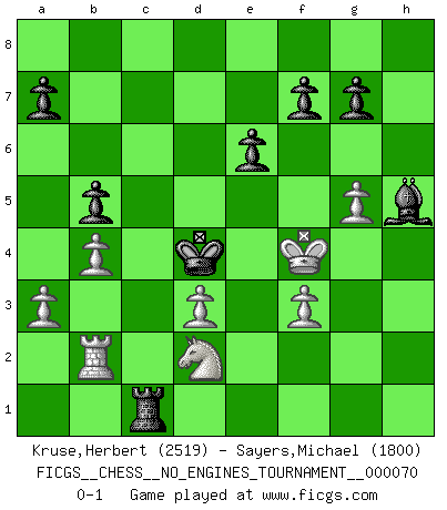Last move : 0-1 2014 April 2 18:41:20 [Event "FICGS__CHESS__NO_ENGINES_TOURNAMENT__000070"] [Site "FICGS"] [Date "2014.02.19"] [Round "1"] [White "Kruse,Herbert"] [Black "Sayers,Michael"] [Result "0-1"] [WhiteElo "2519"] [BlackElo "1800"] 1.e4 d5 2.exd5 c6 3.dxc6 Nxc6 4.Nf3 Bf5 5.Bb5 e6 6.Nc3 Nf6 7.d4 Bd6 8.O-O O-O 9.Bg5 Rb8 10.Re1 Be7 11.h3 Nd5 12.Bxe7 Ndxe7 13.Qd2 Qb6 14.Rad1 Rfd8 15.b3 Nb4 16.Bd3 Nxd3 17.cxd3 h6 18.Rc1 Qb4 19.Red1 Nc6 20.Ne2 Qd6 21.Rc3 Qb4 22.Rc4 Qxd2 23.Rxd2 Rbc8 24.g4 Bh7 25.h4 b5 26.R4c2 Nb4 27.Rxc8 Rxc8 28.Ne1 Kf8 29.a3 Nd5 30.Kf1 Ke7 31.b4 Rc6 32.Rb2 Nf6 33.g5 hxg5 34.hxg5 Nd5 35.Kg2 Kd6 36.Kf3 Bg6 37.Nf4 Nxf4 38.Kxf4 Rc1 39.Nf3 Bh5 40.Nd2 Kd5 41.f3 Kxd4 0-1 Scandinavian (centre counter) defense Kingside Castling by player White (move 8) Kingside Castling by player Black (move 8) Player Black won this chess game. Follow this game move after move (download)Morphy was probably the greatest genius of them all. (Bobby Fischer) Das Schachspiel übertrifft alle anderen Spiele so weit wie der Chimborasso einen Misthaufen. (Arthur Schopenhauer) Un sacrificio se refuta mucho mejor al aceptarlo. (Wilhelm Steinitz) Je menace de comprendre la position. (Anonyme) The best weapon against an enemy is another enemy. (Friedrich Nietzsche)