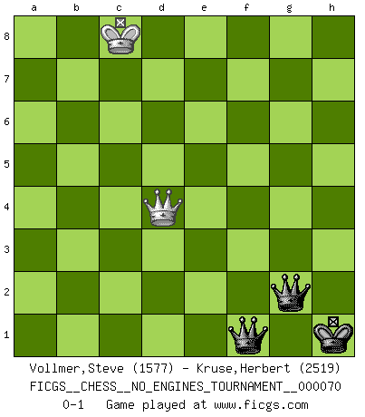 Last move : 0-1 2014 February 22 0:40:33 [Event "FICGS__CHESS__NO_ENGINES_TOURNAMENT__000070"] [Site "FICGS"] [Date "2014.02.19"] [Round "1"] [White "Vollmer,Steve"] [Black "Kruse,Herbert"] [Result "0-1"] [WhiteElo "1577"] [BlackElo "2519"] 1.e4 g6 2.Nf3 Bg7 3.Bc4 c6 4.O-O d5 5.exd5 cxd5 6.Bb3 Nc6 7.d4 Bg4 8.c3 Nf6 9.Bf4 O-O 10.Nbd2 Ne4 11.Re1 Nxd2 12.Bxd2 e5 13.h3 Bxf3 14.Qxf3 exd4 15.Qxd5 dxc3 16.Bxc3 Bxc3 17.bxc3 Qf6 18.Re3 Rad8 19.Qb5 Rd7 20.Rae1 a6 21.Qe2 Kg7 22.Rd1 Rxd1+ 23.Qxd1 Rd8 24.Qe2 Rd7 25.g3 Re7 26.Kg2 Qd6 27.f4 Rxe3 28.Qxe3 Ne7 29.g4 b6 30.Kf3 a5 31.Qd4+ Qxd4 32.cxd4 h6 33.Ke4 f6 34.d5 Nc8 35.d6 Nxd6+ 36.Kd5 Nc8 37.Kc6 f5 38.Kc7 Ne7 39.Kxb6 fxg4 40.hxg4 h5 41.Kxa5 hxg4 42.Bd1 Nc6+ 43.Kb6 g3 44.Bf3 Nd4 45.Be4 Ne2 46.Bb7 Nc3 47.a3 Kf6 48.Kc5 Kf5 49.Kb4 Ne4 50.Bc8+ Kxf4 51.Bh3 Ng5 52.Bg2 Ke3 53.a4 Kf2 54.Bd5 Ne6 55.a5 Nc7 56.Bc6 Na6+ 57.Kb5 Nb8 58.Bd5 g5 59.Kb6 g4 60.Kb7 Nd7 61.Kc7 Ne5 62.a6 Nf3 63.a7 g2 64.Bxf3 gxf3 65.a8Q g1Q 66.Qa7+ Kg2 67.Qa2+ Kh1 68.Qd5 Qg2 69.Kc8 f2 70.Qh5+ Kg1 71.Qd1+ f1Q 72.Qd4+ Kh1 0-1 Robatsch (Modern) defense Kingside Castling by player White (move 4) Kingside Castling by player Black (move 9) 10 pieces endgame at move 40 : White KBPPP , Black KNPPP WHITE : King + 1 Bishop 3 Pawns BLACK : King + 1 Knight 3 Pawns 9 pieces endgame at move 41 : White KBPPP , Black KNPP WHITE : King + 1 Bishop 3 Pawns BLACK : King + 1 Knight 2 Pawns 8 pieces endgame at move 41 : White KBPP , Black KNPP WHITE : King + 1 Bishop 2 Pawns BLACK : King + 1 Knight 2 Pawns 7 pieces endgame at move 50 : White KBP , Black KNPP WHITE : King + 1 Bishop 1 Pawn BLACK : King + 1 Knight 2 Pawns 6 pieces endgame at move 64 : White KBP , Black KPP WHITE : King + 1 Bishop 1 Pawn BLACK : King + 2 Pawns 5 pieces endgame at move 64 : White KP , Black KPP WHITE : King + 1 Pawn BLACK : King + 2 Pawns Promotion Queen by player White (move 65) Promotion Queen by player Black (move 65) Promotion Queen by player Black (move 71) Player Black won this chess game. Follow this game move after move (download)Of all my Russian books, the defense contains and diffuses the greatest 'warmth' which may seem odd seeing how supremely abstract Chess is supposed to be. (Vladimir Nabokov) Die westlichen Werte sind eine Sprache, welche die Putin-Administration nicht versteht. (Garry Kasparov) Sin errores no puede haber brillantez. (Emanuel Lasker) Mais n'est-ce pas déjà le limiter injurieusement que d'appeler les échecs un jeu? N'est-ce pas aussi une science, un art, ou quelque chose qui, comme le cercueil de Mahomet entre ciel et terre, est suspendu entre l'un et l'autre, et qui réunit un nombre incroyable de contraires ? (Stefan Zweig) Computer Science is no more about computers than astronomy is about telescopes. (Edsger W. Dijkstra)