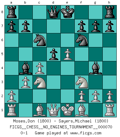 Last move : 0-1 2014 May 3 8:52:53 [Event "FICGS__CHESS__NO_ENGINES_TOURNAMENT__000070"] [Site "FICGS"] [Date "2014.02.19"] [Round "1"] [White "Moses,Don"] [Black "Sayers,Michael"] [Result "0-1"] [WhiteElo "1800"] [BlackElo "1800"] 1.e4 d5 2.exd5 c6 3.c4 Nf6 4.Nc3 cxd5 5.d4 Nc6 6.Nf3 Bg4 7.b3 e5 8.dxe5 Bb4 0-1 This chess game has been lost on time (started : 2014.02.19 17:50:57) Scandinavian (centre counter) defense Player Black won this chess game. Follow this game move after move (download)Pawns: they are the soul of this game, they alone form the attack and defense. (Philidor) Ich suche im Schach immer etwas Eigenes. Riskantes Spiel im Stile schachlicher Musketiere ist nicht meine Sache, auch wenn es vielen Freunden scharfer Wendungen gefällt. (Anatoly Karpov) Buenas posiciones no logran ganar juegos, buenas movidas sí. (Gerald Abrahams) Le profane ne songe pas à la somme de jouissance dont il se prive, qui méconnaît ce jeu aux ressources aussi variées que passionnantes. (Jean-Marie Jeanton-Lamarche) If you don't practice you don't deserve to win. (Andre Agassi)