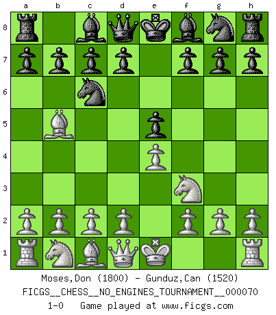 Last move : 1-0 2014 April 2 7:7:28 [Event "FICGS__CHESS__NO_ENGINES_TOURNAMENT__000070"] [Site "FICGS"] [Date "2014.02.19"] [Round "1"] [White "Moses,Don"] [Black "Gunduz,Can"] [Result "1-0"] [WhiteElo "1800"] [BlackElo "1520"] 1.e4 e5 2.Nf3 Nc6 3.Bb5 1-0 This chess game has been lost on time (started : 2014.02.19 17:50:57) Ruy Lopez (Spanish Opening) Player White won this chess game. Follow this game move after move (download)Chess is not like life... it has rules ! (Mark Pasternak) Weshalb minderdergeübte Spieler mit g2-g4 beginnen? Die betreffenden sind unschlüssig, ob sie nun rechts (h4) oder links (f4) beginnen sollen, und in ihrer Ratlosigkeit entschliessen sie sich nach guter Bürgerart dazu, den goldenen Mittelweg zu wählen. (Aaron Nimzowitsch) Peones: ellos son el alma de esta partida, solos forman el ataque y la defensa. (Philidor) L'ordinateur a tué l'originalité. Il n'y a plus guère d'aventures sur l'échiquier. (Jacob Murray) Better than a thousand days of diligent study is one day with a great teacher. (Japanese proverb)