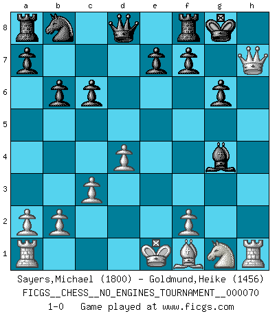 Last move : 1-0 2014 May 7 6:29:36 [Event "FICGS__CHESS__NO_ENGINES_TOURNAMENT__000070"] [Site "FICGS"] [Date "2014.02.19"] [Round "1"] [White "Sayers,Michael"] [Black "Goldmund,Heike"] [Result "1-0"] [WhiteElo "1800"] [BlackElo "1456"] 1.e4 d5 2.d4 dxe4 3.Bf4 Nf6 4.c3 Bf5 5.Qb3 b6 6.Qb5+ Bd7 7.Qe5 c6 8.Nd2 g6 9.Nxe4 Bg7 10.Nxf6+ Bxf6 11.Qe3 O-O 12.Bh6 Bg7 13.Bxg7 Kxg7 14.h4 Bg4 15.h5 Bxh5 16.g4 Bxg4 17.Qh6+ Kg8 18.Qxh7+ 1-0 Scandinavian (centre counter) defense Kingside Castling by player Black (move 11) Player White won this chess game. Follow this game move after move (download)I believe that Chess possesses a magic that is also a help in advanced age. A rheumatic knee is forgotten during a game of Chess and other events can seem quite unimportant in comparison with a catastrophe on the chessboard. (Vlastimil Hort) Frage: Was machen Sie mit den Preisen? Anwort: Ich habe Angst, dass meine Freundin davon neue Kleider kauft. (Loek van Wely) El Ajedrez es despiadado: debes de estar preparado para matar gente. (Nigel Short) Vouloir jouer aux échecs contre soi-même est aussi paradoxal que vouloir marcher sur son ombre. (Stefan Zweig) It's only after you lost everything, Tyler says, that you're free to do anything. (Chuck Palahniuk, Fight Club)