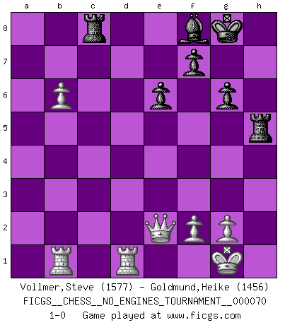 Last move : 1-0 2014 March 18 21:54:21 [Event "FICGS__CHESS__NO_ENGINES_TOURNAMENT__000070"] [Site "FICGS"] [Date "2014.02.19"] [Round "1"] [White "Vollmer,Steve"] [Black "Goldmund,Heike"] [Result "1-0"] [WhiteElo "1577"] [BlackElo "1456"] 1.d4 d5 2.c4 c6 3.Nc3 Nf6 4.Nf3 Be6 5.Qc2 dxc4 6.a4 Qa5 7.e4 Nbd7 8.Be2 b5 9.O-O g6 10.Be3 Bg7 11.axb5 Qb6 12.d5 cxd5 13.Bxb6 Nxb6 14.exd5 Nfxd5 15.Nxd5 Bxd5 16.Rfd1 O-O 17.Rab1 Rfd8 18.h4 a6 19.bxa6 Rxa6 20.h5 Na4 21.hxg6 hxg6 22.Nd4 Nc5 23.Bxc4 Bxc4 24.Qxc4 Rc8 25.Nb3 Rac6 26.Nxc5 Rxc5 27.Qe2 e6 28.b4 Rh5 29.b5 Bf8 30.b6 1-0 QGD Slav defense Kingside Castling by player White (move 9) Kingside Castling by player Black (move 16) Player White won this chess game. Follow this game move after move (download)No other master has such a terrific will to win. At the board he radiates danger, and even the strongest opponents tend to freeze, like rabbits when they smell a panther. Even his weaknesses are dangerous. As white, his opening game is predictable - you can make plans against it - but so strong that your plans almost never work. In the middle game his precision and invention are fabulous, and in the end game you simply cannot beat him. (Anonymous German Expert) Wir irren allesamt, nur jeder irrt anders. (Georg Christoph Lichtenberg) La captura del Rey enemigo es la finalidad pero no el primer objetivo de la partida. (William Steinitz) Le succès, c'est être capable d'aller d'échec en échec sans perdre son enthousiasme. (Winston Churchill) We're missing something. (Gregory House, House M.D.)