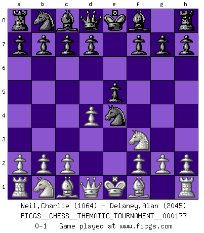 Last move : 0-1 2014 February 20 22:12:27 [Event "FICGS__CHESS__THEMATIC_TOURNAMENT__000177"] [Site "FICGS"] [Date "2014.02.20"] [Round "1"] [White "Neil,Charlie"] [Black "Delaney,Alan"] [Result "0-1"] [WhiteElo "1064"] [BlackElo "2045"] 1.e4 e5 2.Nf3 Nf6 3.d4 Nxe4 0-1 Petrov : Modern attack, Symmetrical variation Player Black won this chess game. Follow this game move after move (download)All Chess players should have a hobby. (Savielly Tartakower) Wie bekannt hörte Morphy 1859 auf, Schach zu spielen. Seine Enttäuschung galt nicht so sehr dem Schach, wie den Schachspielern. (Robert James Fischer) Bobby solo arroja las piezas y solas caen en las casillas correctas. (Miguel Najdorf ) Mais n'est-ce pas déjà le limiter injurieusement que d'appeler les échecs un jeu? N'est-ce pas aussi une science, un art, ou quelque chose qui, comme le cercueil de Mahomet entre ciel et terre, est suspendu entre l'un et l'autre, et qui réunit un nombre incroyable de contraires ? (Stefan Zweig) They misunderestimated me. (George W. Bush, Bentonville nov. 6, 2000)