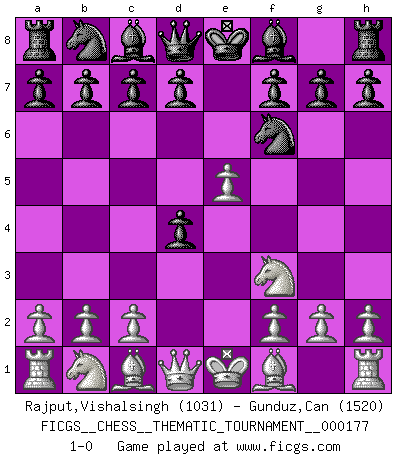 Last move : 1-0 2014 April 2 7:7:28 [Event "FICGS__CHESS__THEMATIC_TOURNAMENT__000177"] [Site "FICGS"] [Date "2014.02.20"] [Round "1"] [White "Rajput,Vishalsingh"] [Black "Gunduz,Can"] [Result "1-0"] [WhiteElo "1031"] [BlackElo "1520"] 1.e4 e5 2.Nf3 Nf6 3.d4 exd4 4.e5 1-0 This chess game has been lost on time (started : 2014.02.20 16:20:59) Petrov : Modern (Steinitz) attack Player White won this chess game. Follow this game move after move (download)Examine moves that smite! A good eye for smites is far more important than a knowledge of strategical principles. (Purdy) Warum muß ich gegen diesen IDIOTEN verlieren? (Aaron Nimzowitsch) Dejen al perfeccionista jugar por correo. (Yasser Seirawan) Les échecs, c'est l'imagination. (David Bronstein) The problem with troubleshooting is that trouble shoots back. (Anonymous)