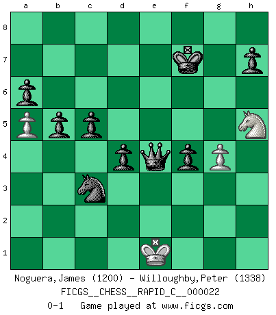 Last move : 0-1 2007 April 5 1:38:57 [Event "FICGS__CHESS__RAPID_C__000022"] [Site "FICGS"] [Date "2007.02.12"] [Round "1"] [White "Noguera,James"] [Black "Willoughby,Peter"] [Result "0-1"] [WhiteElo "1200"] [BlackElo "1338"] 1.e4 e6 2.Nf3 d5 3.d3 c5 4.Nc3 Nc6 5.Be2 Nf6 6.Bf4 Bd6 7.e5 d4 8.Nb1 Nd5 9.Qd2 Bc7 10.O-O O-O 11.c3 Nxf4 12.Qxf4 f6 13.h4 Nxe5 14.Nbd2 Nxd3 15.Qe4 Nxb2 16.h5 Na4 17.h6 f5 18.Qc2 Nxc3 19.Bd3 Rf6 20.hxg7 a6 21.a4 Bd6 22.Nc4 e5 23.Ncxe5 Qe8 24.Rfe1 Qh5 25.Qd2 Rh6 26.Bc4+ Kxg7 27.Qxh6+ Qxh6 28.g3 f4 29.g4 b6 30.Bf1 Qf6 31.a5 b5 32.Bd3 Bxe5 33.Nxe5 Bb7 34.f3 Re8 35.Nd7 Rxe1+ 36.Rxe1 Qh4 37.Re5 Qg3+ 38.Kf1 Qxf3+ 39.Ke1 Qxd3 40.Re7+ Kg8 41.Nf6+ Kf8 42.Re8+ Kg7 43.Nh5+ Kf7 44.Re5 Be4 45.Rxe4 Qxe4+ 0-1 French defense Kingside Castling by player White (move 10) Kingside Castling by player Black (move 10) Player Black won this chess game. Follow this game move after move (download)The passed Pawn is a criminal, who should be kept under lock and key. Mild measures, such as police surveillance, are not sufficient. (Aaron Nimzovich) Wer mein Gambit spielt, muß bereit sein, alle Brücken hinter sich abzubrechen. Es verändert den ganzen Menschen. Es wirkt wie ein Zauberstab und fördert verkümmerte, gute Charakter- eigenschaften wieder zu Tage. (Emil Joseph Diemer) Realmente no sabemos como el juego fue inventado, aunque hay sospechas. Tan pronto como descubramos a los culpables, se los haremos saber. (Bruce Pandolfini) En blitz, le Cavalier l'emporte sur le Fou. (Vlastimil Hort) Somehow our devils are never quite what we expect when we meet them face to face. (Nelson DeMille)