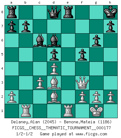 Last move : 1/2-1/2 2014 April 24 22:18:48 [Event "FICGS__CHESS__THEMATIC_TOURNAMENT__000177"] [Site "FICGS"] [Date "2014.02.20"] [Round "1"] [White "Delaney,Alan"] [Black "Benone,Mateia"] [Result "1/2-1/2"] [WhiteElo "2045"] [BlackElo "1186"] 1.e4 e5 2.Nf3 Nf6 3.d4 Nxe4 4.Bd3 d5 5.Nxe5 Nd7 6.Nxd7 Bxd7 7.O-O Bd6 8.c4 c6 9.Nc3 O-O 10.cxd5 Nxc3 11.bxc3 cxd5 12.Qh5 f5 13.Qf3 Kh8 14.Bd2 Bc6 15.Rfe1 g6 16.Rab1 Re8 1/2-1/2 Petrov : Modern attack, Symmetrical variation Kingside Castling by player White (move 7) Kingside Castling by player Black (move 9) This chess game ended in a draw. Follow this game move after move (download)Chess is a beautiful mistress. (Bent Larsen) Glücklicherweise sind Großmeister Ruben Fines reine Schachbücher weniger phallozentrisch [als seine Schachpsychologie] und deswegen auch weniger lächerlich. (Nigel Short) ¿Que sería del Ajedrez sin errores graciosos?. (Kurt Richter) Shah mat. Le roi est mort. Cri de fierté d'un joueur venant de terrasser son adversaire, courtoisement, sans effusion de sang. A good book on your shelf is a friend that turns its back on you and remains a friend. (Author unknown)