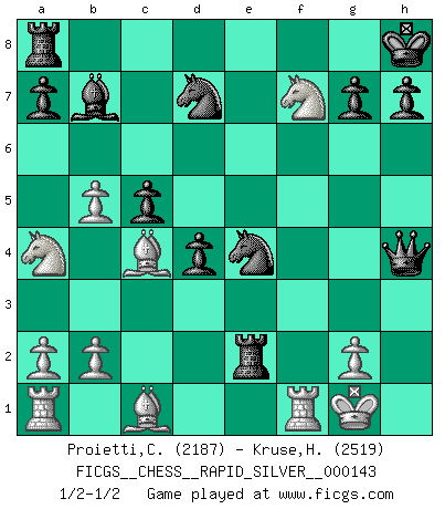 Last move : 1/2-1/2 2014 March 4 19:32:26 [Event "FICGS__CHESS__RAPID_SILVER__000143"] [Site "FICGS"] [Date "2014.02.21"] [Round "2"] [White "Proietti,Costantino"] [Black "Kruse,Herbert"] [Result "1/2-1/2"] [WhiteElo "2187"] [BlackElo "2519"] 1.d4 Nf6 2.Nf3 e6 3.c4 c5 4.d5 b5 5.dxe6 fxe6 6.cxb5 d5 7.Nc3 Nbd7 8.e4 d4 9.Na4 Bb7 10.Bc4 Bd6 11.O-O O-O 12.Ng5 Nxe4 13.Nxe6 Bxh2+ 14.Kxh2 Qh4+ 15.Kg1 Rxf2 16.Qe2 Rxe2 17.Nd8 Kh8 18.Nf7+ Kg8 19.Nh6+ Kh8 20.Nf7+ 1/2-1/2 Comment by player 1 : Costantino Proietti : This is the first time I play against the Blumenfeld gambit, so I’m not familiar with the strategy. I chose the exchange variation 5.dxe6 as it seemed to me it could weaken a bit the king side. I tried a minor variation at 9th move (9. Na4) as I didn’t find 9. e5 and 9.Nb1 good for a clear advantage. Unfortunately I saw after the very first analisys that B. could equalize: 12. Nxe6 Kh8 13. e5 Nxe5! 14.Nxe5 Bxe5 15.Nxc5 Bxh2+ 16.Kh1 Qb6! 17. Nxb7 Bc7!= So against a very strong opponent I decided to go for a quick draw. Probably is better to try 5. Bg5 Herbert Kruse 10. Bd3 is good and i will not play it again therefore Costantino Proietti I am baffled! I have not analyzed at all 10. Bd3. I do not think that's never happened before! Maybe I need to change something in the routine analysis. This move seems to give a clear advantage to White that keeps the pawn advantage and a strong initiative. Queen's pawn game Kingside Castling by player White (move 11) Kingside Castling by player Black (move 11) This chess game ended in a draw. Follow this game move after move (download)Many Chess players were surprised when after the game, Fischer quietly explained: 'I had already analyzed this possibility' in a position which I thought was not possible to foresee from the opening. (Mikhail Tal) Die unerbitterlichsten Regeln im Schach sind die Ausnahmen. (Savielly Grigorievitsch Tartakower) PrefererÃa tener un Peón que un dedo. (Reuben Fine) Vous n'êtes pas toujours obligé de jouer le meilleur coup. Un coup doit être actif, entreprenant, correct et beau ! (David Bronstein) Creativity is allowing yourself to make mistakes. Art is knowing which ones to keep. (Scott Adams)
