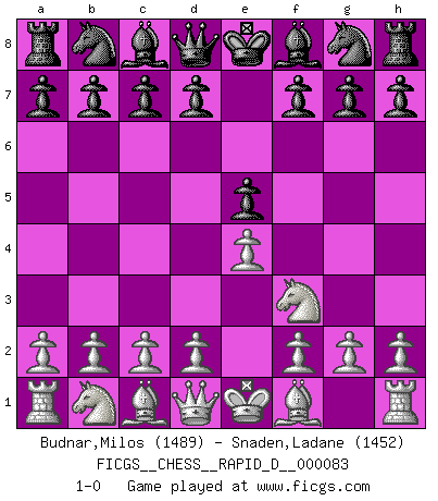 Last move : 1-0 2014 March 26 16:53:7 [Event "FICGS__CHESS__RAPID_D__000083"] [Site "FICGS"] [Date "2014.02.21"] [Round "1"] [White "Budnar,Milos"] [Black "Snaden,Ladane"] [Result "1-0"] [WhiteElo "1489"] [BlackElo "1452"] 1.e4 e5 2.Nf3 1-0 This chess game has been lost on time (started : 2014.02.21 22:19:55) King's knight Opening Player White won this chess game. Follow this game move after move (download)The passion for playing Chess is one of the most unaccountable in the world. (H.G. Wells) Kostenjuk hat keinen Sexappeal. (Loek van Wely) Solo existe una cosa que Fischer hace en el Ajedrez sin placer: ¡perder!. (Boris Spassky) On peut tirer plus d'utilité d'une partie perdue que de 100 parties gagnées. (Capablanca) I have opinions of my own - strong opinions - but I don't always agree with them. (George Bush)