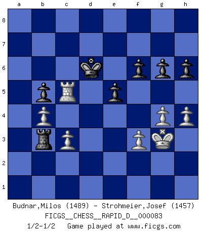 Last move : 1/2-1/2 2014 July 15 22:44:25 [Event "FICGS__CHESS__RAPID_D__000083"] [Site "FICGS"] [Date "2014.02.21"] [Round "1"] [White "Budnar,Milos"] [Black "Strohmeier,Josef"] [Result "1/2-1/2"] [WhiteElo "1489"] [BlackElo "1457"] 1.e4 c5 2.Nf3 d6 3.d4 cxd4 4.Nxd4 Nf6 5.Nc3 a6 6.Be3 e5 7.Nb3 Be7 8.Be2 O-O 9.O-O Be6 10.Bg5 h6 11.Bxf6 Bxf6 12.Bg4 Bc4 13.Be2 Be6 14.Nd5 Nd7 15.Nxf6 Nxf6 16.Bf3 Qc7 17.Rc1 Rad8 18.c3 d5 19.Qc2 dxe4 20.Bxe4 Nxe4 21.Qxe4 b5 22.Rfe1 f6 23.h3 Rd7 24.Qb4 Rc8 25.Rcd1 Rcd8 26.Rxd7 Qxd7 27.Nc5 Qc6 28.Nxe6 Qxe6 29.Qb3 Qxb3 30.axb3 Rd2 31.Rb1 Rc2 32.b4 Kf7 33.g4 Ke6 34.Kg2 g6 35.h4 Kd5 36.Rd1+ Ke6 37.Ra1 Rxb2 38.Rxa6+ Kf7 39.Rc6 Rb3 40.Rc5 Ke6 41.Kg3 Kd6 42.f3 Ke6 43.Rc6+ Ke7 44.Rc7+ Kd6 45.Rc5 Ke7 46.Rc7+ Kd6 47.Rc5 1/2-1/2 Sicilian : Najdorf, Byrne (English) attack Kingside Castling by player Black (move 8) Kingside Castling by player White (move 9) This chess game ended in a draw. Follow this game move after move (download)Chess, like any creative activity, can exist only through the combined efforts of those who have creative talent, and those who have the ability to organize their creative work. (Mikhail Botvinnik) Sitze auf Deine Hände. (Siegbert Tarrasch) Cuando tengo las piezas blancas, yo gano porque soy blanco; Cuando tengo las piezas negras, yo gano porque soy Bogolyubov. (Bogolyubov) Karpov est une pièce de musée. (Garry Kasparov) When the going gets tactical, the computers get going. (Hyatt)