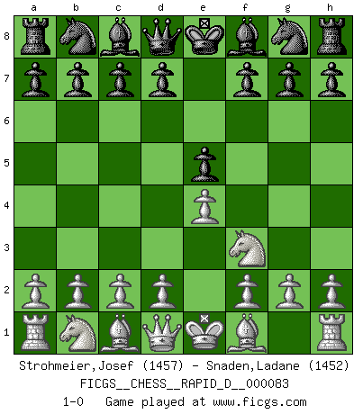 Last move : 1-0 2014 March 27 4:55:10 [Event "FICGS__CHESS__RAPID_D__000083"] [Site "FICGS"] [Date "2014.02.21"] [Round "1"] [White "Strohmeier,Josef"] [Black "Snaden,Ladane"] [Result "1-0"] [WhiteElo "1457"] [BlackElo "1452"] 1.e4 e5 2.Nf3 1-0 This chess game has been lost on time (started : 2014.02.21 22:19:55) King's knight Opening Player White won this chess game. Follow this game move after move (download)The battle for the ultimate truth will never be won. And that's why Chess is so fascinating. (Hans Kmoch) Ich spiele 70 Eröffnungssysteme. (Viktor Kortschnoi) ¿Esta Bobby Fischer algo cuerdo?. (Salo Flohr) Botvinnik disait en comparant les échecs à la musique: Il existe une science dont le but est l'étude de l'acoustique et des sons. Mais il y a aussi un art qui se sert de l'océan des sons : c'est la musique. De toute évidence, il en est de même pour la pensée. La logique est l'étude des lois de la réflexion et les échecs reflètent, en tant qu'art, le côté logique de la réflexion, sous la forme d'images artistiques... Extrait de Fischer - Spassky, Reykjavik 1972 par Alexander & F. Wyndham (Ed. Solar), p 37. An expert is a man who has made all the mistakes which can be made in a very narrow field. (Niels Bohr)