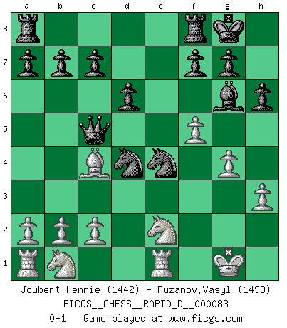 Last move : 0-1 2014 April 21 9:48:47 [Event "FICGS__CHESS__RAPID_D__000083"] [Site "FICGS"] [Date "2014.02.21"] [Round "1"] [White "Joubert,Hennie"] [Black "Puzanov,Vasyl"] [Result "0-1"] [WhiteElo "1442"] [BlackElo "1498"] 1.e4 e5 2.Nf3 Nc6 3.Bc4 Nf6 4.d4 exd4 5.O-O d6 6.Bg5 Be7 7.Re1 Bg4 8.h3 Bh5 9.g4 Bg6 10.Nxd4 O-O 11.f4 h6 12.Bh4 Nxe4 13.Bxe7 Qxe7 14.f5 Qe5 15.Ne2 Qc5+ 16.Qd4 Nxd4 0-1 Two knights defense Kingside Castling by player White (move 5) Kingside Castling by player Black (move 10) Player Black won this chess game. Follow this game move after move (download)Pawns are born free, yet they are everywhere in chains. (Rick Kennedy) Das typische an einem Großmeister ist, daß er eine gewonnene Position schnell und schmerzlos gewinnt. (Irving Chernev) Los Peones son nacidos libres, y aún así, se encuentran encadenados por todos lados. (Rick Kennedy) Nous sommes les pions de la mystérieuse partie d'Echecs jouée par Dieu. Il nous déplace, nous arrête, nous pousse encore, puis nous lance un à un dans la boîte du Néant. Epitaphe sur la tombe de David Janowsky (1868-1927). Political correctness is subjecting us to gross incompetence. (Johann Piek)