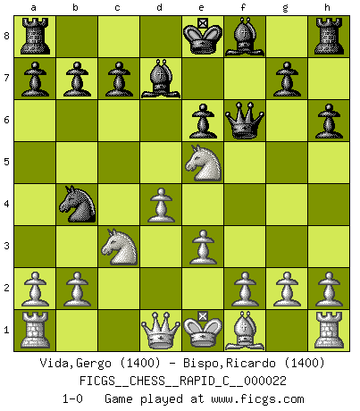 Last move : 1-0 2007 April 2 21:36:53 [Event "FICGS__CHESS__RAPID_C__000022"] [Site "FICGS"] [Date "2007.02.12"] [Round "1"] [White "Vida,Gergo"] [Black "Bispo,Ricardo"] [Result "1-0"] [WhiteElo "1400"] [BlackElo "1400"] 1.d4 Nf6 2.c4 d5 3.Nc3 Nc6 4.Nf3 e6 5.Bg5 h6 6.Bxf6 Qxf6 7.cxd5 Nb4 8.dxe6 fxe6 9.e3 Bd7 10.Ne5 1-0 This chess game has been lost on time (started : 2007.02.12 23:3:27) Queen's pawn game Player White won this chess game. Follow this game move after move (download)You can only get good at Chess if you love the game. (Bobby Fischer) Offener Brief an US-Präsident Bush anlässlich der Verhaftung Bobby Fishers: Verhaften Sie mich. Stecken Sie mich in dieselbe Zelle wie Bobby Fisher und geben Sie uns ein Schachspiel mit. (Boris Vassilievich Spassky) Morphy probablemente fue el genio más grande de todos. (Bobby Fischer) Le succès, c'est être capable d'aller d'échec en échec sans perdre son enthousiasme. (Winston Churchill) Everybody lies. (Gregory House, House M.D.)