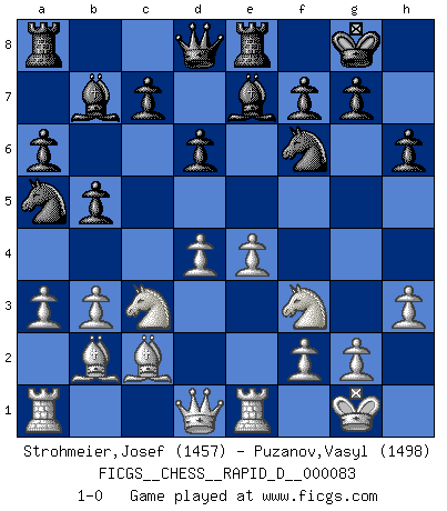 Last move : 1-0 2014 May 9 21:13:15 [Event "FICGS__CHESS__RAPID_D__000083"] [Site "FICGS"] [Date "2014.02.21"] [Round "1"] [White "Strohmeier,Josef"] [Black "Puzanov,Vasyl"] [Result "1-0"] [WhiteElo "1457"] [BlackElo "1498"] 1.e4 e5 2.Nf3 Nc6 3.Bb5 a6 4.Ba4 b5 5.Bb3 Bc5 6.c3 Nf6 7.O-O O-O 8.d4 exd4 9.cxd4 Bb4 10.a3 Be7 11.Nc3 d6 12.h3 h6 13.Re1 Na5 14.Bc2 Bb7 15.b3 Re8 16.Bb2 1-0 This chess game has been lost on time (started : 2014.02.21 22:19:55) Ruy Lopez : Graz variation Kingside Castling by player White (move 7) Kingside Castling by player Black (move 7) Player White won this chess game. Follow this game move after move (download)The passed pawn is a criminal, who should be kept under lock and key. Mild measures, such as police surveillance, are not sufficient. (Nimzovitch) Offensichtlich kennt Kasparow nichts anderes als Schach, und ich könnte 500 weitere Spieler dieser Sorte benennen. (Judith Polgar) El Ajedrez es una guerra en un tablero. El objetivo es aplastar la mente del oponente. (Bobby Fischer) Shah mat. Le roi est mort. Cri de fierté d'un joueur venant de terrasser son adversaire, courtoisement, sans effusion de sang. Train yourself to let go of everything you fear to lose. (Master Yoda in Star Wars ep.3)
