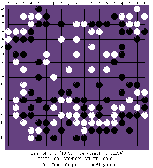Last move : 1-0 2014 October 13 23:1:27 [Event "FICGS__GO__STANDARD_SILVER__000011"] [Site "FICGS"] [Date "2014.02.21"] [Round "1"] [Black "Lehnhoff,Heinz-Georg"] [White "de Vassal,Thibault"] [Result "1-0"] [Rating 1 "1873"] [Rating 2 "1594"] 1.q16 c4 2.q4 d17 3.e4 e3 4.f3 d3 5.f4 d7 6.c5 b5 7.e2 d2 8.c15 c16 9.d15 c11 10.f17 e18 11.d5 b6 12.d8 c8 13.e7 k4 14.m3 k6 15.c7 b7 16.d6 c9 17.f18 b16 18.e17 c18 19.b15 k17 20.m17 k15 21.q10 k13 22.k9 m5 23.q13 o4 24.k2 l3 25.l2 m4 26.n3 p5 27.q5 p6 28.o3 m14 29.l7 h5 30.k7 j7 31.j8 h7 32.h8 a15 33.h3 m16 34.n6 p4 35.p3 q6 36.n17 l17 37.r3 r7 38.r9 n16 39.r5 m6 40.o7 s8 41.s9 s6 42.t7 t8 43.l6 k5 44.n5 n4 45.g7 g6 46.q8 m11 47.o17 r17 48.r16 q18 49.q17 s17 50.p18 r18 51.a14 a16 52.h17 h15 53.d16 s16 54.s15 t18 55.b13 b12 56.c13 j11 57.n9 o11 58.e19 d18 59.f6 p13 60.p12 o13 61.q14 g10 62.e10 f12 63.e12 f13 64.t16 s19 65.j4 j5 66.g2 g4 67.l5 l4 68.s5 t5 69.t6 1-0 Here are the names of the openings (joseki) played in the four corners : Corner d4 : c4 e4 Komoku (Somok, Xiao~mu`) 3-4 Point. The komoku (3-4) point is the traditional corner enclosure move.. Ikken Takagakari (Hankan Nop'dakeolch'im, Yi Gaogua`jiao~, 1-Space High Approach). The 5-4 approach move has become more popular in modern times, as modern Go emphasizes speed and influence. Corner d16 : d17 c15 Komoku (Somok, Xiao~mu`) 3-4 Point. The komoku (3-4) point is the traditional corner enclosure move.. Ikken Kakari (Hankan Keolch'im, Yi Gua`jiao~, 1-Space Low Pincer). The small knight move is the basic approach move to the 3-4 point stone. It has been continually used for over four centuries. There are limitless variations, with new moves constantly being discovered. Black 2 opens the door to a treaure store of joseki. Player Black won this Go (weiqi, baduk) game. Follow this game move after move (download)Territory really exists only in the end. (Pierre Audouard) They say in chess you've got to kill the queen, and then you mate it... Oh I, do you ? (Red Hot Chili Peppers, Fortune faded)