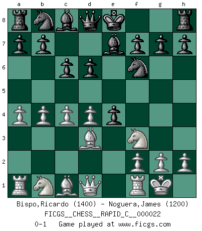 Last move : 0-1 2007 March 25 21:16:18 [Event "FICGS__CHESS__RAPID_C__000022"] [Site "FICGS"] [Date "2007.02.12"] [Round "1"] [White "Bispo,Ricardo"] [Black "Noguera,James"] [Result "0-1"] [WhiteElo "1400"] [BlackElo "1200"] 1.e4 e5 2.Nf3 Nf6 3.d4 d6 4.c4 Be7 5.a4 c6 6.b4 Nxe4 7.Bd3 Nf6 8.O-O e4 0-1 This chess game has been lost on time (started : 2007.02.12 23:3:27) Petrov : Modern (Steinitz) attack Kingside Castling by player White (move 8) Player Black won this chess game. Follow this game move after move (download)I had a toothache during the first game. In the second game I had a headache. In the third game it was an attack of rheumatism. In the fourth game, I wasn't feeling well. And in the fifth game? Well, must one have to win every game ? (Siegbert Tarrasch) Deine Wertungszahl - vorausgesetzt einige Jahre schachliche Anstrengung - entspricht etwa dem zehnfachen Deines IQ plus 1000. (Jonathan Levitt) Diferente gente reacciona diferentemente en aceptar la derrota. (Bobby Fischer) Des combinaisons [dans le jeu d'échecs] pareilles à des mélodies. Je crois entendre pour ainsi dire la musique des coups... (Vladimir Nabokov) Gambling is the son of avarice and the father of despair. (French proverb)