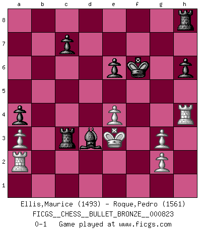 Last move : 0-1 2014 February 22 22:15:58 [Event "FICGS__CHESS__BULLET_BRONZE__000823"] [Site "FICGS"] [Date "2014.02.22"] [Round "1"] [White "Ellis,Maurice"] [Black "Roque,Pedro"] [Result "0-1"] [WhiteElo "1493"] [BlackElo "1561"] 1.d4 f5 2.c4 e6 3.Nc3 Nf6 4.Nf3 Bb4 5.Qb3 a5 6.a3 a4 7.Qc2 Bxc3+ 8.bxc3 b6 9.Bg5 Bb7 10.Ne5 d6 11.Nd3 h6 12.Bh4 g5 13.Bg3 f4 14.Nxf4 gxf4 15.Qg6+ Kd7 16.Bxf4 Qe7 17.c5 Be4 18.Qg3 bxc5 19.dxc5 Nh5 20.Qe3 Qf6 21.Bg3 Nxg3 22.hxg3 d5 23.f3 Bg6 24.Qd4 Ke7 25.e3 Nc6 26.Qd2 Rab8 27.Be2 Na5 28.Qd4 Nb3 29.Qxf6+ Kxf6 30.Ra2 Nxc5 31.Kf2 Nd3+ 32.Bxd3 Bxd3 33.Rh4 Rb1 34.e4 dxe4 35.fxe4 Rc1 36.Ke3 Rxc3 0-1 Dutch defense, Rubinstein variation Player Black won this chess game. Follow this game move after move (download)I believe that Chess possesses a magic that is also a help in advanced age. A rheumatic knee is forgotten during a game of Chess and other events can seem quite unimportant in comparison with a catastrophe on the chessboard. (Vlastimil Hort) Ja, jede Frau in Holland liebt mich bestimmt, und alle Männer hassen mich. (Loek van Wely) Solo existe una cosa que Fischer hace en el Ajedrez sin placer: ¡perder!. (Boris Spassky) Les échecs sont plus proches de l'art de l'assassinat que de l'art de la guerre. (Arturo Perez-Reverte) A mistake is only a mistake if you let it happen twice. Otherwise it is a learning experience. (Daniel Parmet)