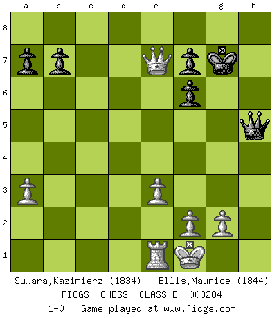 Last move : 1-0 2014 November 17 16:20:49 [Event "FICGS__CHESS__CLASS_B__000204"] [Site "FICGS"] [Date "2014.02.24"] [Round "1"] [White "Suwara,Kazimierz"] [Black "Ellis,Maurice"] [Result "1-0"] [WhiteElo "1834"] [BlackElo "1844"] 1.e4 e5 2.Nf3 Nf6 3.Nxe5 d6 4.Nf3 Nxe4 5.Bd3 Nf6 6.O-O Nc6 7.h3 Be7 8.c3 d5 9.Re1 O-O 10.b4 Re8 11.Qc2 Bd6 12.Re3 Ne5 13.Nxe5 Rxe5 14.Rxe5 Bxe5 15.Bf1 d4 16.Na3 c6 17.Nc4 Bc7 18.cxd4 Qxd4 19.Bb2 Qd5 20.Bd3 Be6 21.Bxf6 gxf6 22.Bxh7+ Kh8 23.Ne3 Qe5 24.Re1 Bxh3 25.Kf1 Qh2 26.Be4 Be6 27.Bf5 Kg7 28.b5 cxb5 29.Ke2 Re8 30.Bxe6 Rxe6 31.Qf5 Qf4 32.Qxb5 Bb6 33.a3 Re5 34.Qb4 Re4 35.Qb1 Qg4+ 36.Kf1 Bxe3 37.dxe3 Re7 38.Qb4 Qh5 39.Qxe7 1-0 Petrov's defense Kingside Castling by player White (move 6) Kingside Castling by player Black (move 9) Player White won this chess game. Follow this game move after move (download)Even the laziest King flees wildly in the face of a double check ! (Aaron Nimzowitsch) Du musst nicht gut spielen, es reicht, wenn du besser spielst als dein Gegner. (Anonymous) Todo se encuentra en un estado de flujo y esto incluye al mundo del Ajedrez. (Mikhail Botvinnik) Soyez une menace à chaque fois que vous vous asseyez pour jouer. (Ken Smith) It is not enough to be a good player... you must also play well. (Siegbert Tarrasch)